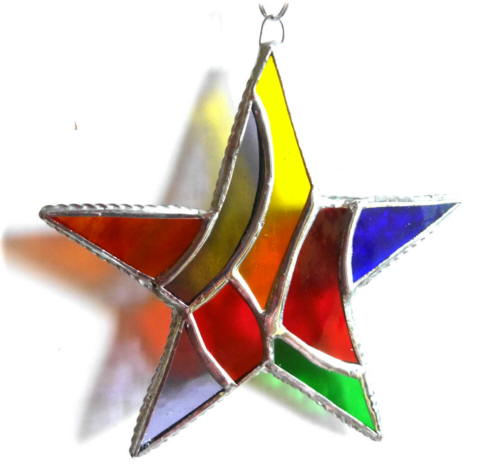 I've designed it as a pentagram, a 5 point star which is patchworked into lots of differently shaped pieces in all different types and shades of Rainbow glass.