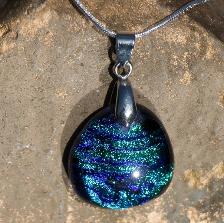 Multiple shades of blue and turquoise make lovely patterns in this glass pendant.