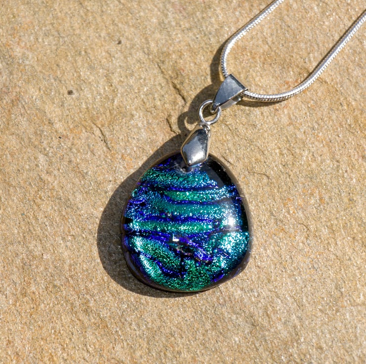 This rounded triangular pendant is approximately 2.8 cm long and 2.2 cm at its widest. After being treated to a session in the kiln, it was carefully drilled and fitted with a silver-coloured metal swivel bail. It is strung from a sterling silver chain. It will be shipped in a small presentation box.