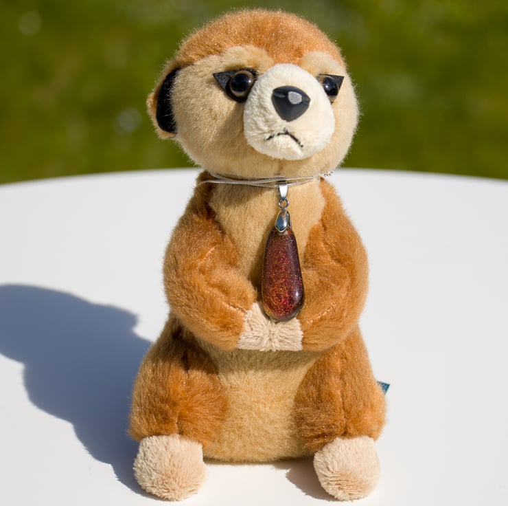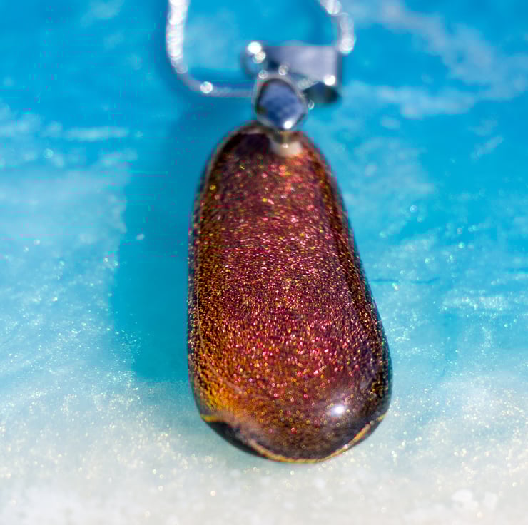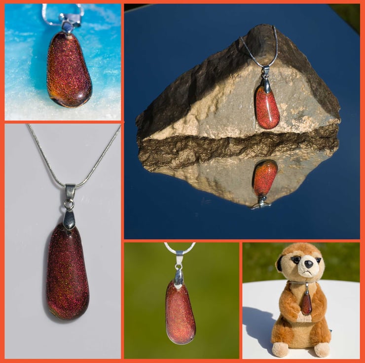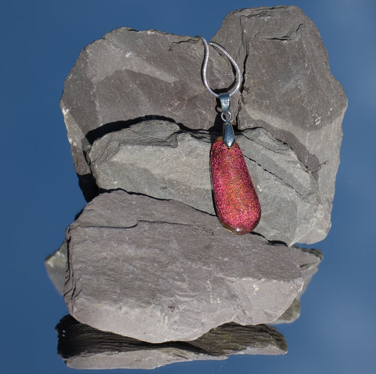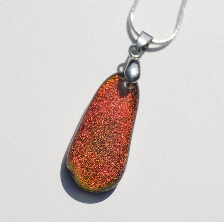 This pendant is an elongated teardrop in shape, and is approximately 3.5 cm long and 1.5 cm at its widest. After being treated to a session in the kiln, it was carefully drilled and fitted with a silver-coloured metal swivel bail. It is strung from a sterling silver chain. It will be shipped in a small presentation box.