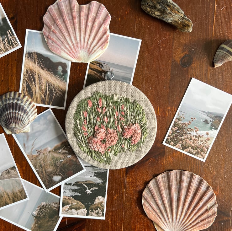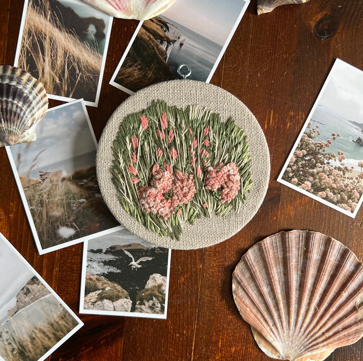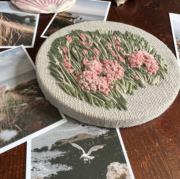 An embroidered floral study of the Pink Valerian flowers that litter the clifftops at Port Isaac.