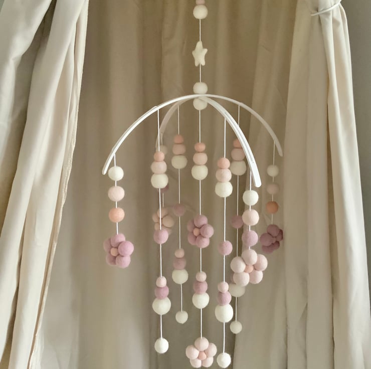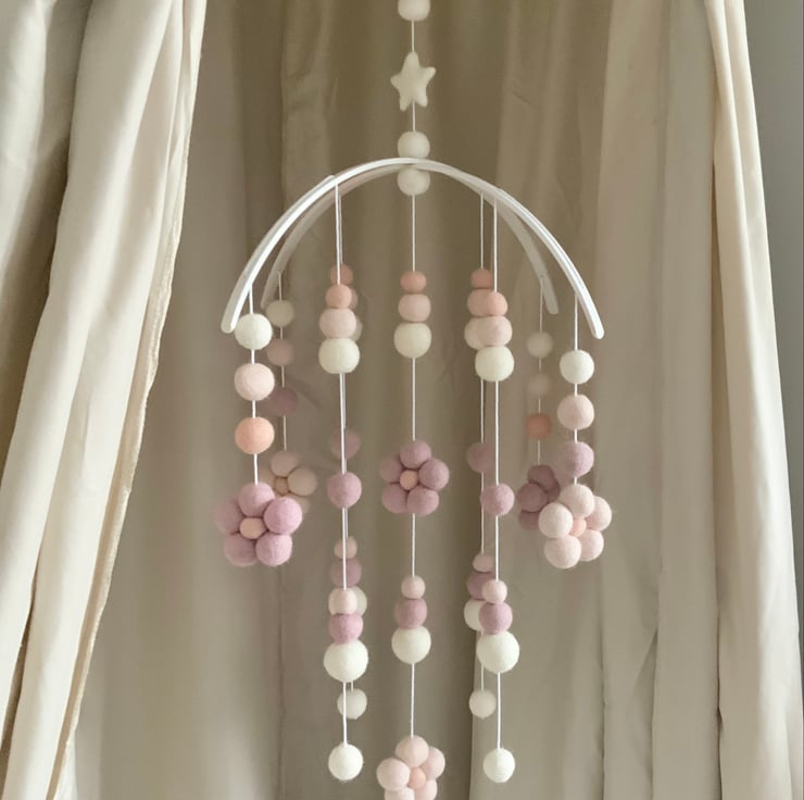 This stunning felt ball mobile is unique, strung onto an arched bamboo hanger to create and engaging graceful visual effect that will capture your little ones attention.