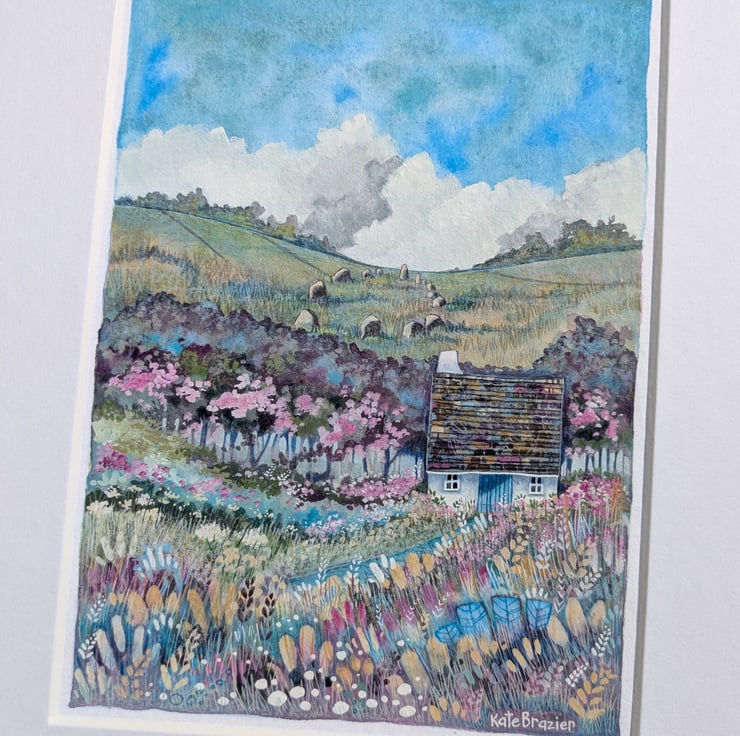 'Folklore Cottage' takes a nostalgic look at a little cottage nestled in the trees with an ancient stone circle on the hill behind. Inspired by the colour palette of 1950's book illustrations, this painting gives a nod to the past.