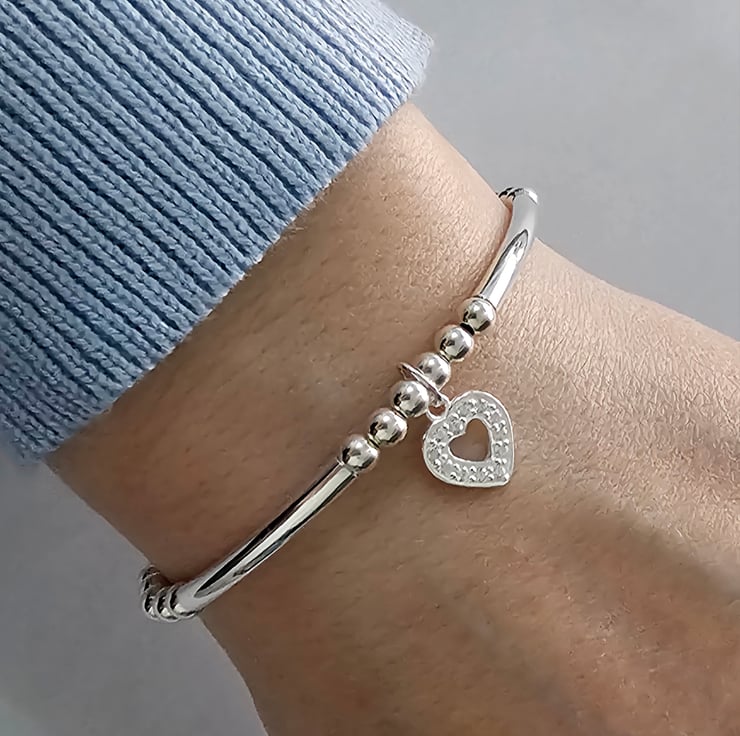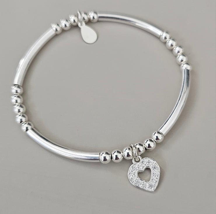 Made with 925 Sterling Silver 3mm wide curved tubes and 4mm round sterling silver beads with a 9mm Sterling silver cubic zirconia heart charm. Each bracelet has a hallmarked 925 tag.