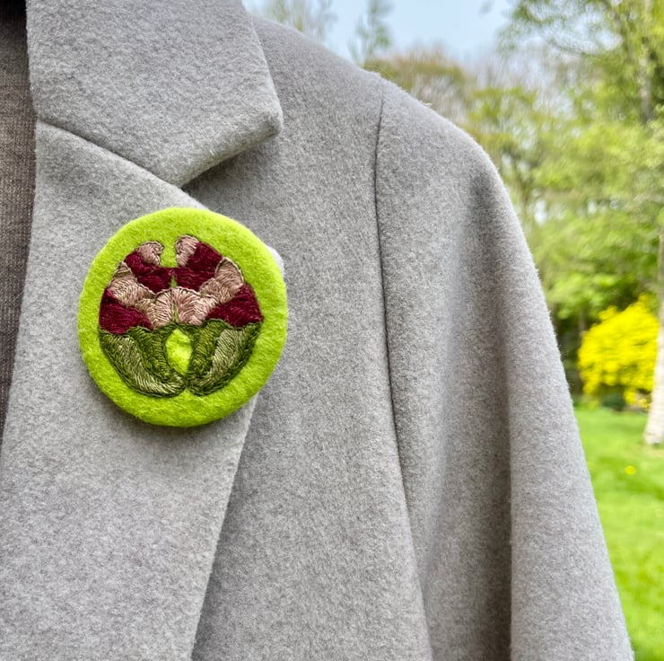 Hand crafted and hand stitched using fine embroidery thread onto wool felt, this circular brooch depicts a blooming flower in beautiful shades of pink and maroon.