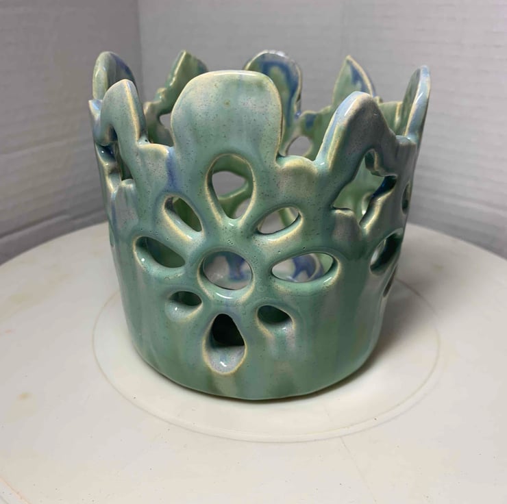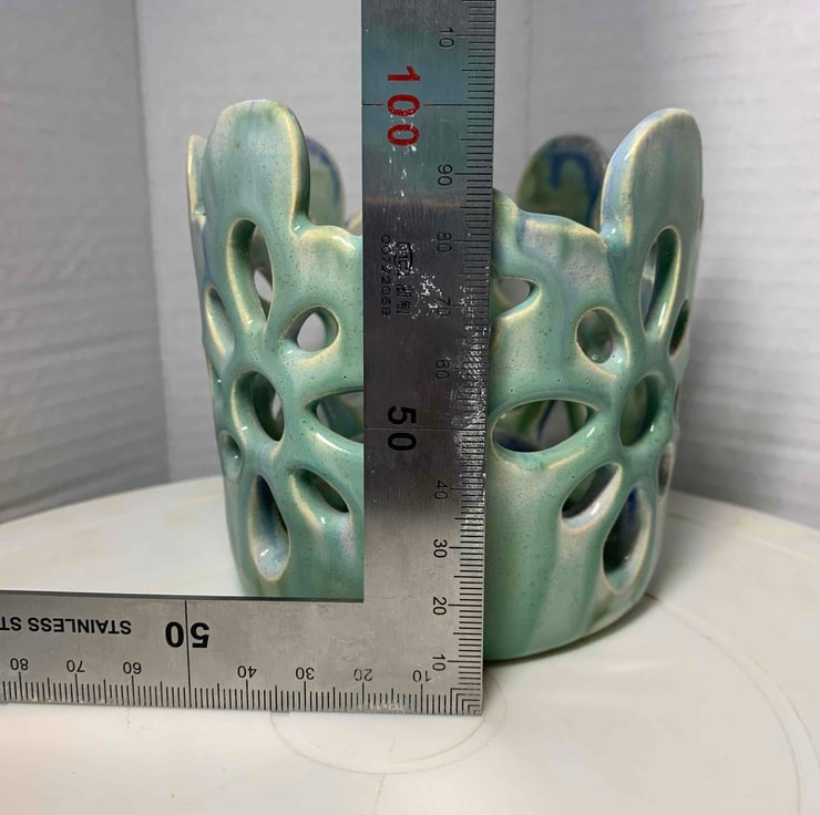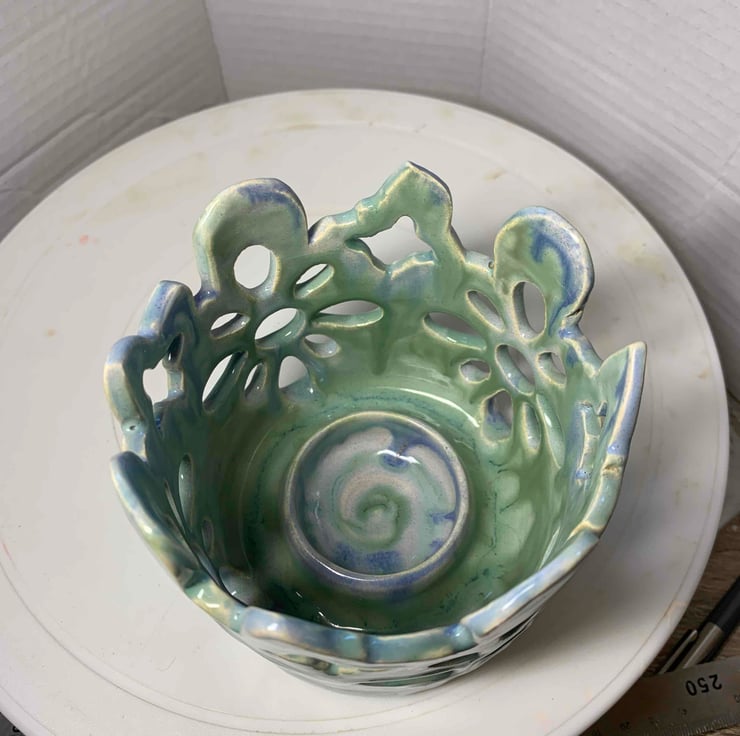 This beautiful hand thrown ceramic tea light holder is hand pierced to make pretty shadows and is hand painted in lovely blue / green flowing glazes.