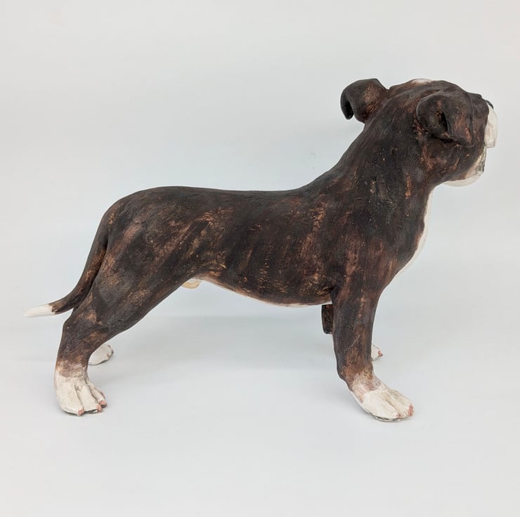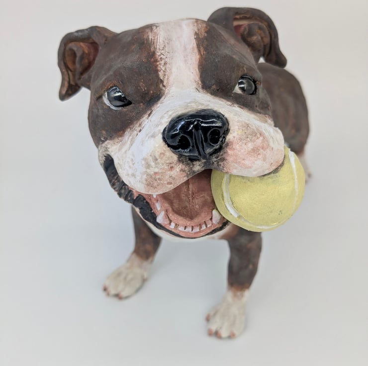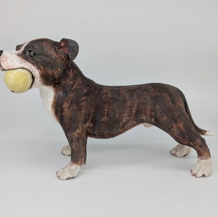 Brindle Staffy Boy and Ball hand sculpted in stoneware clay.