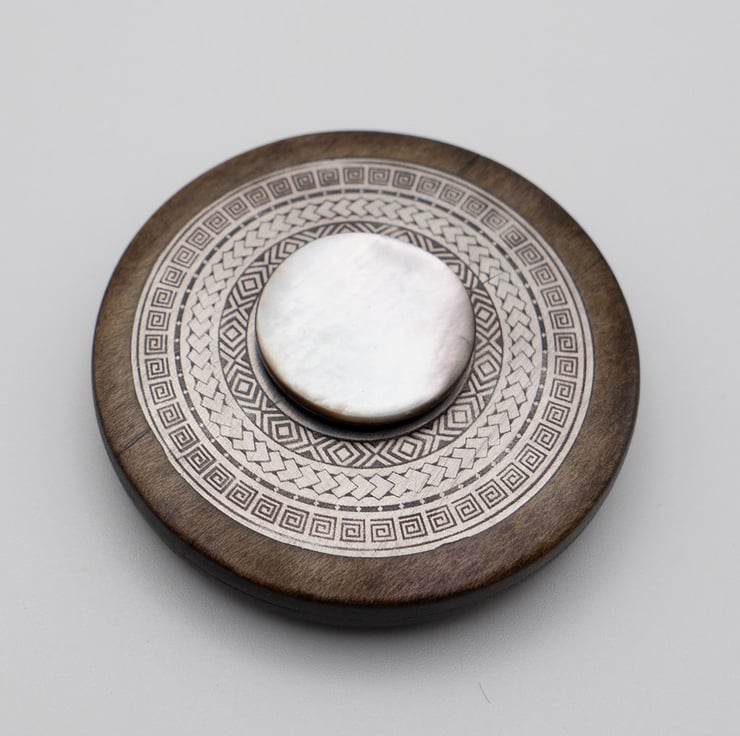 Spinners are hand made and crafted from up-cycled hard wood, mother of pearl buttons and aluminium cans. The metal is etched with a tribal roundel design and inlaid into the wood spinner which is finished with a smooth lacquer.