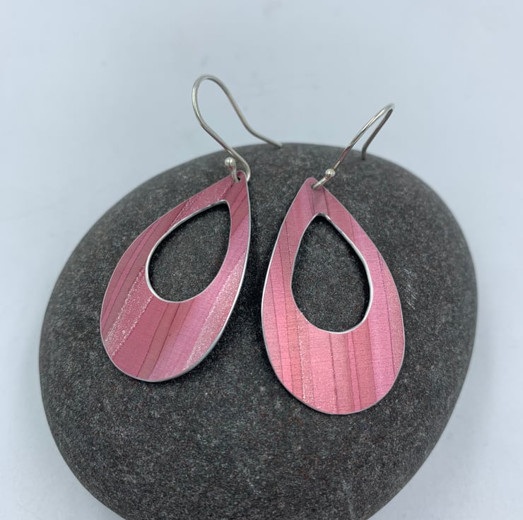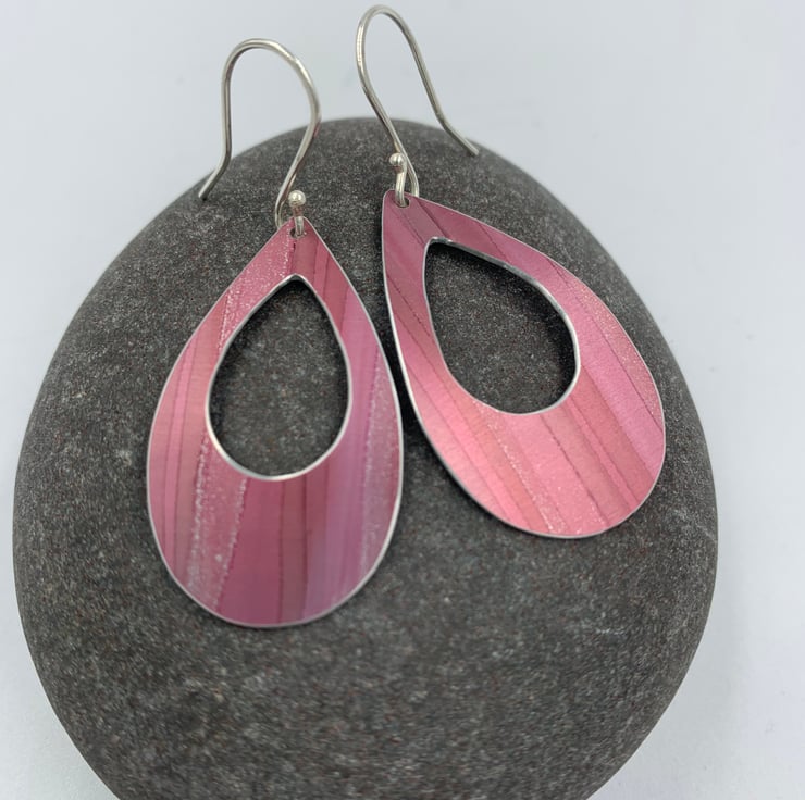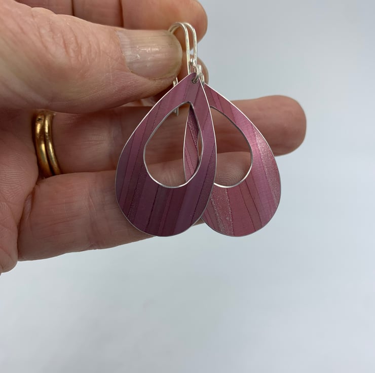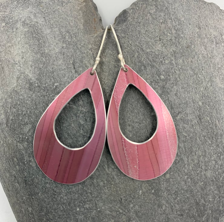 These statement handmade aluminium earrings feature a large teardrop shape with smaller cut out.
