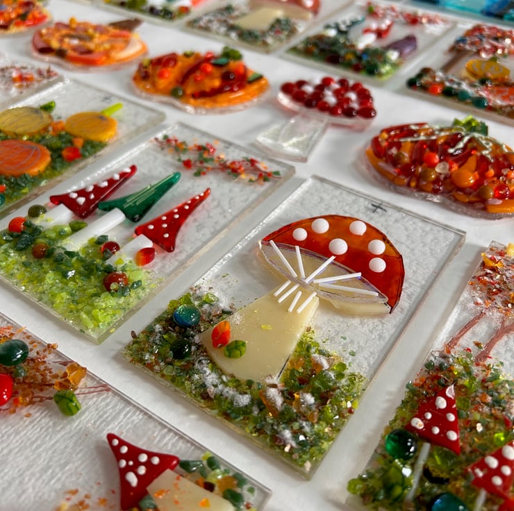 In this workshop you will create several pumpkin / toadstool / Autumn themed decorations! You will learn how to build up your decorations by using glass pieces, rods, glass paint and frits (crushed glass). You will also get the opportunity to learn how to cut glass too if you wish!