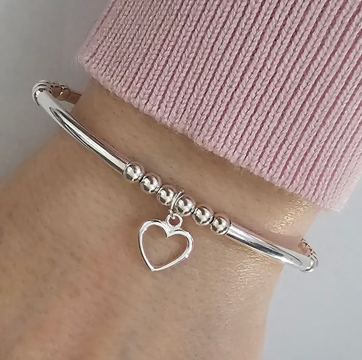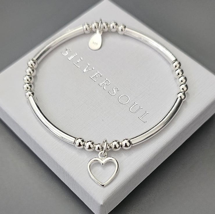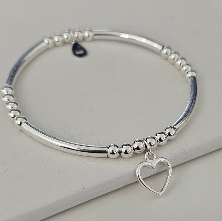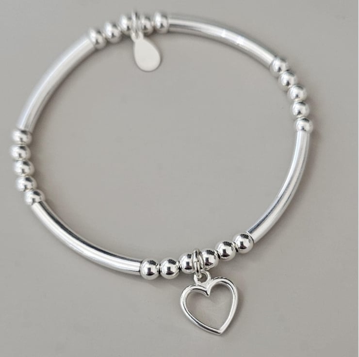 Sterling Silver Open Heart charm stretch bracelet, made with good quality materials. This bracelet is truly a beautiful piece to own and one for your jewellery collection, with a lovely heart charm that makes it extra special. This bracelet is made with Sterling silver 4mm beads and Sterling silver noodle tubes with a 10mm open heart charm. Each bracelet has a hallmarked 925 tag.