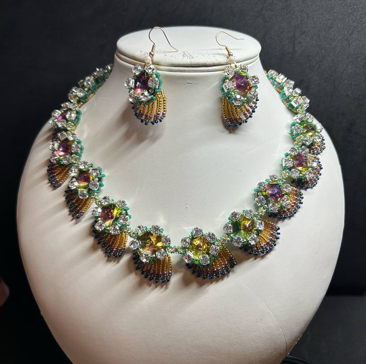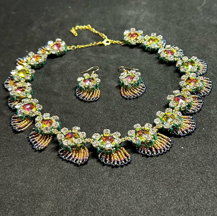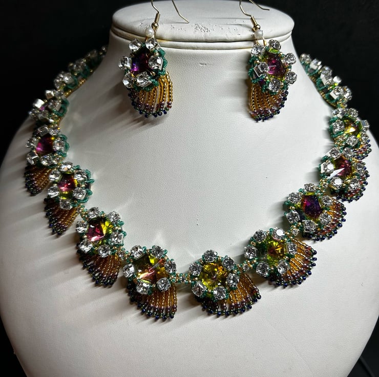 Art Deco Peacock Necklace and Earrings Set handmade crystal and seed beads