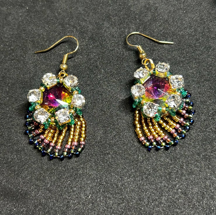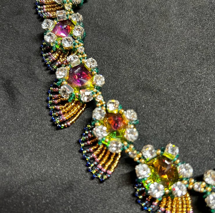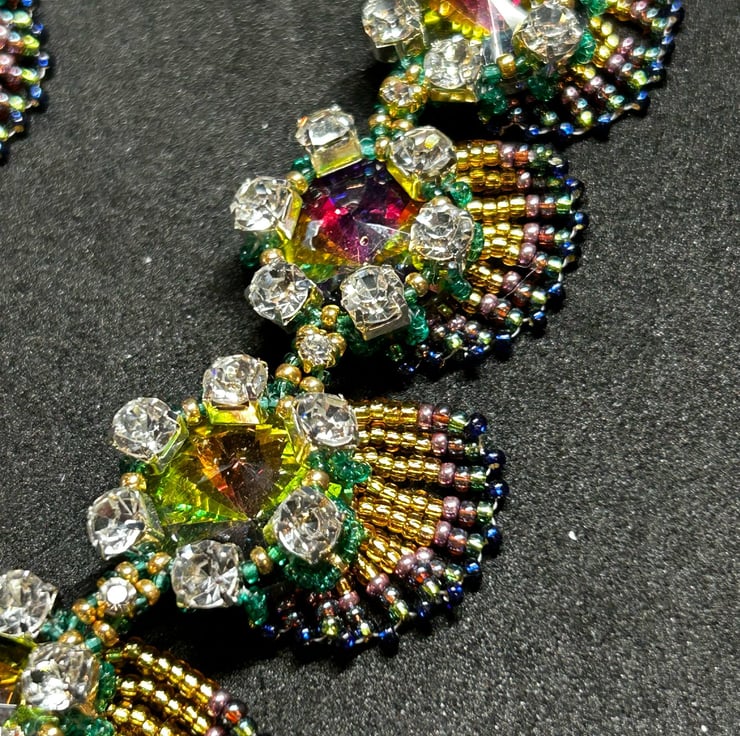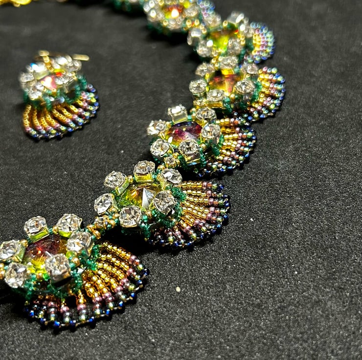 I used watermelon crystals in each component, which change colour as you move. They are glorious! I surrounded each crystal with a halo of claw-set Austrian crystals, which have a purity of beauty and sparkle. Each component is then set off with an Art Deco fan of seed beads in stunning Peacock colours.