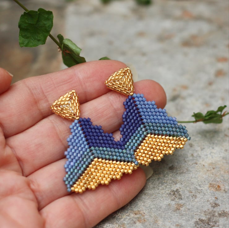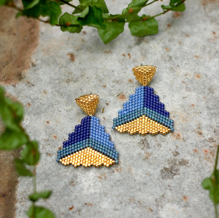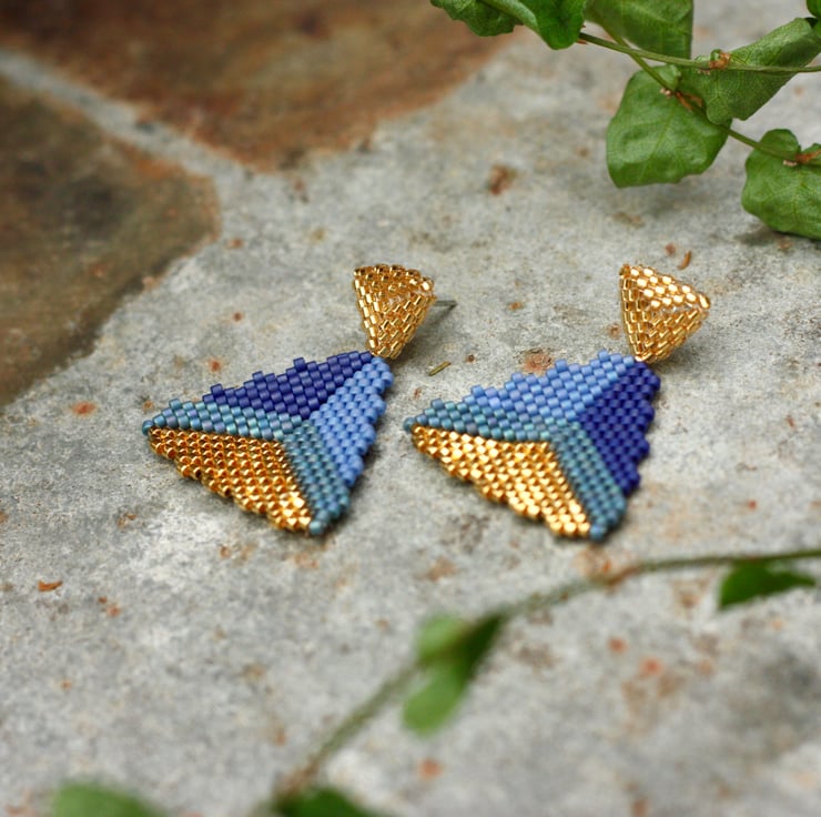 Beautiful moody blues and gold drop earrings. Hand woven with 24k gold plated Miyuki beads into a large central triangle with a picot edge.