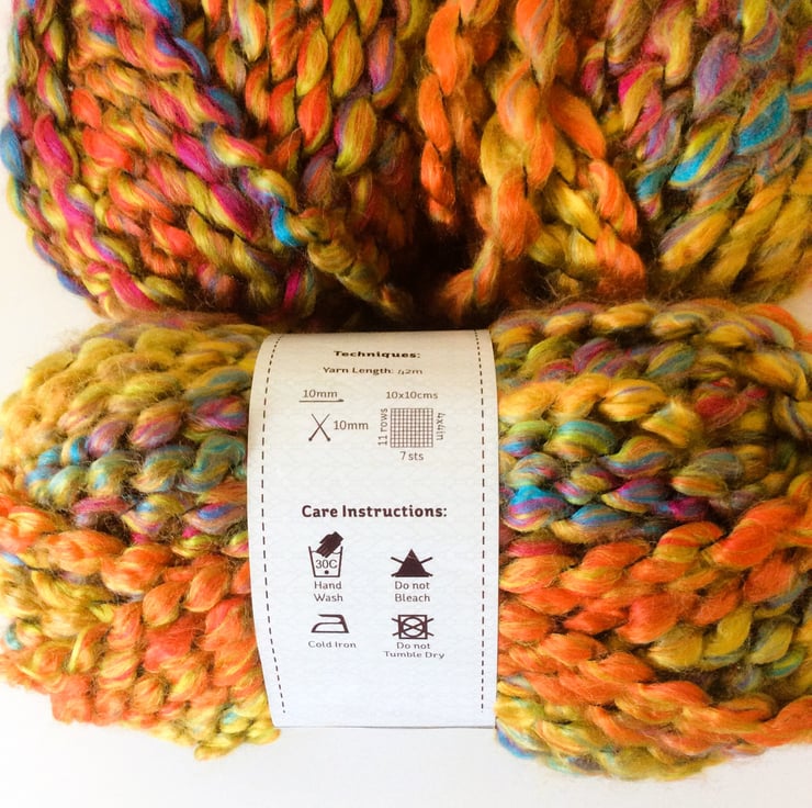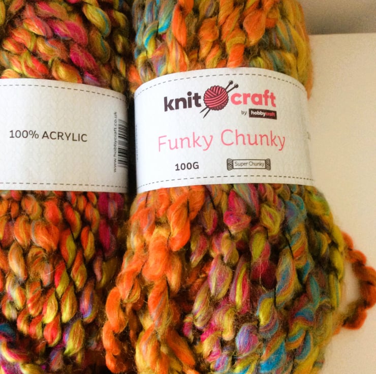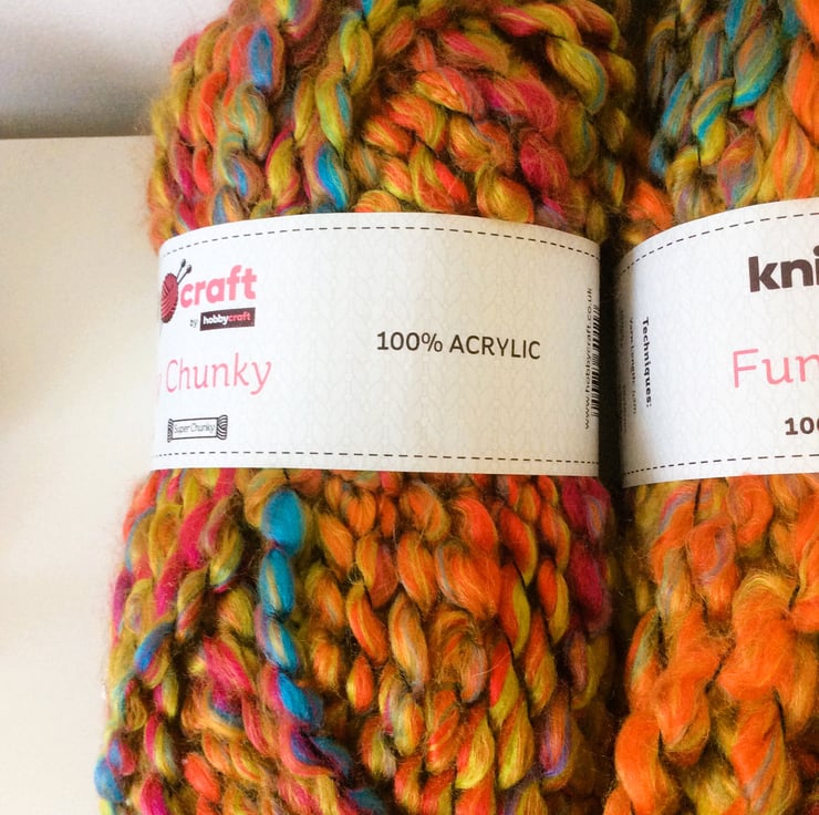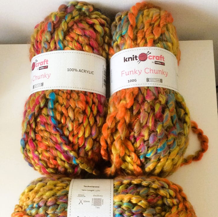 I have 3 x 100g balls of unused/unopened super chunky multicoloured wool. It is 100% acrylic, hand washable at 30 degrees and can be ironed (cold). The yarn length on each ball is approx 42m.
