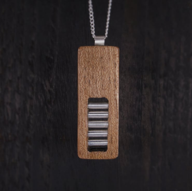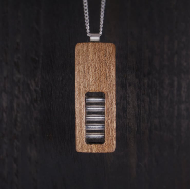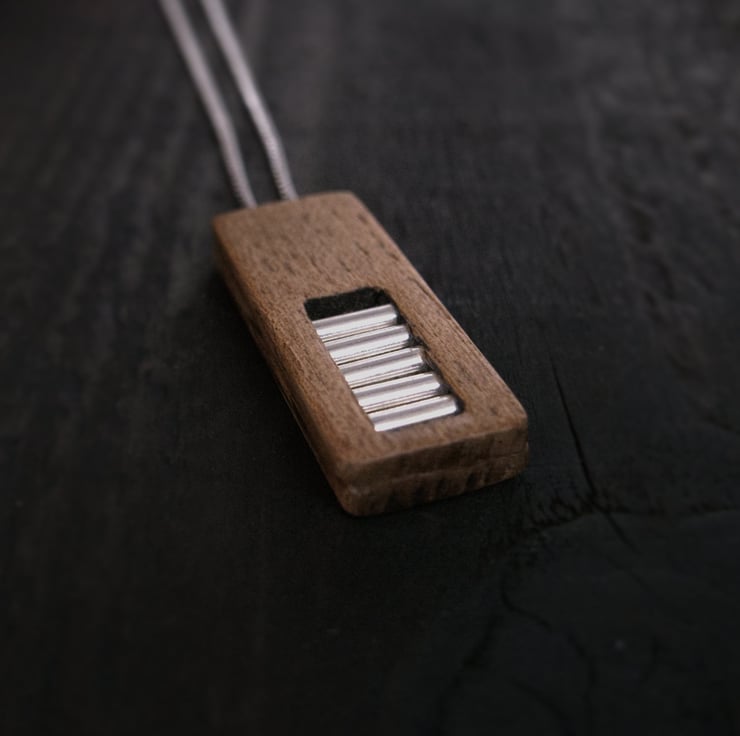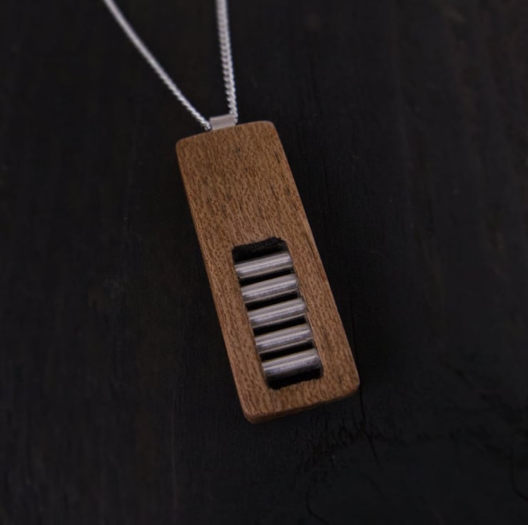 The jewellery chain, bail and ladder are made from recycled Sterling Silver and the pendant is made from hardwood offcuts sourced in the UK.