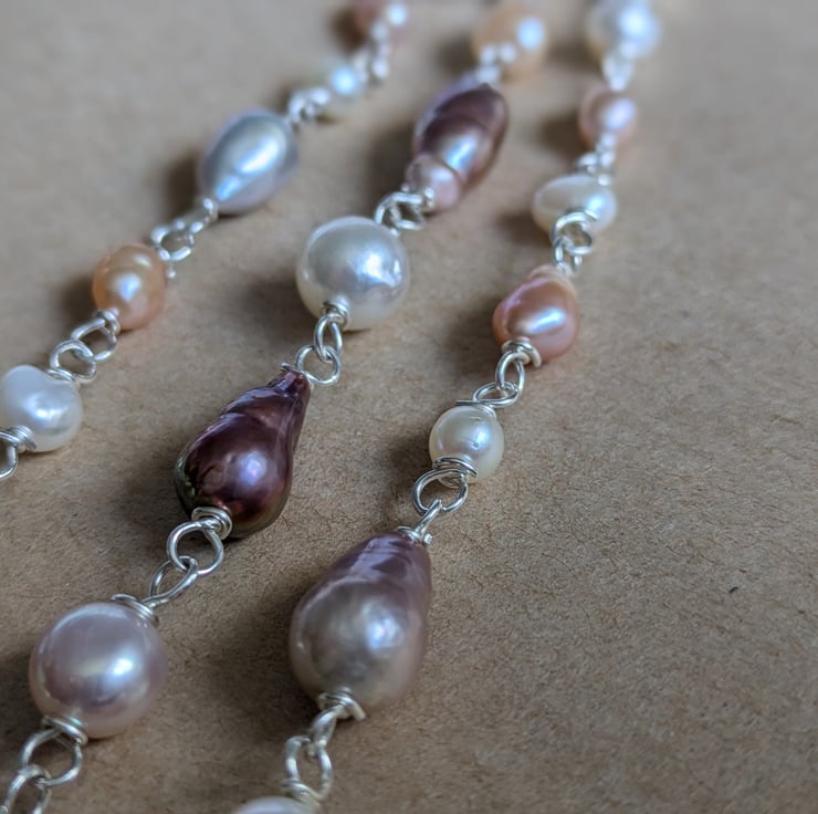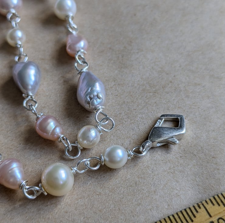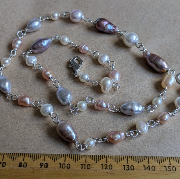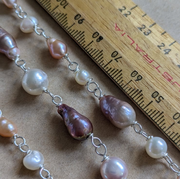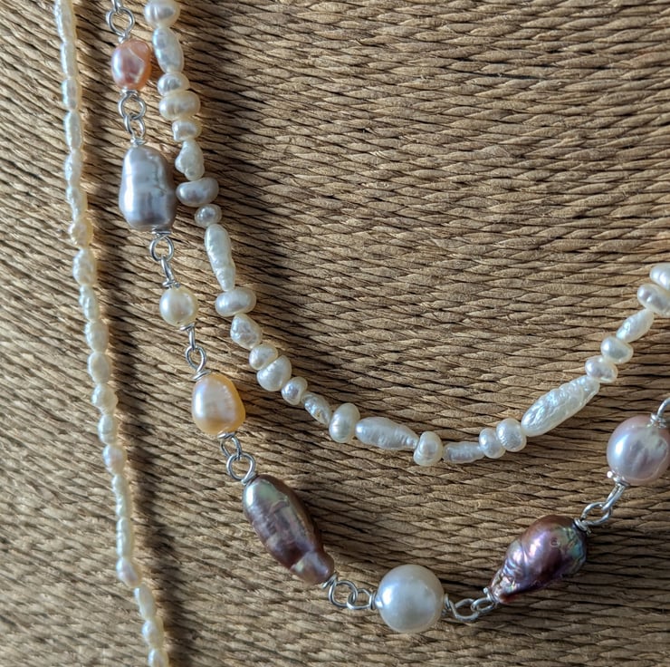 The Silver and Pearls Necklace - this very special necklace was inspired by the uniqueness and individuality of pearls! Each pearl on this necklace has its own quirks and personality and you'll notice something new and beautiful each time you look at this piece. I wire wrapped an array of different pearls in solid sterling silver wire, including vintage akoya from 1960s/1970s Japan, a south sea pearl from Indonesia, and several different kinds of Chinese freshwater pearls from different decades including some more recent nucleated freshwaters with stunning purple colour and lustre. The necklace is finished with a chunky sterling silver clasp and measures 54cm in length. It will look great on its own or layered with others (as shown in the last two photos). Please note that the jewellery display mannequin is not life-size. Please do check your own measurements to confirm desired fit and examine the photos of the necklace next to a centimetre ruler.