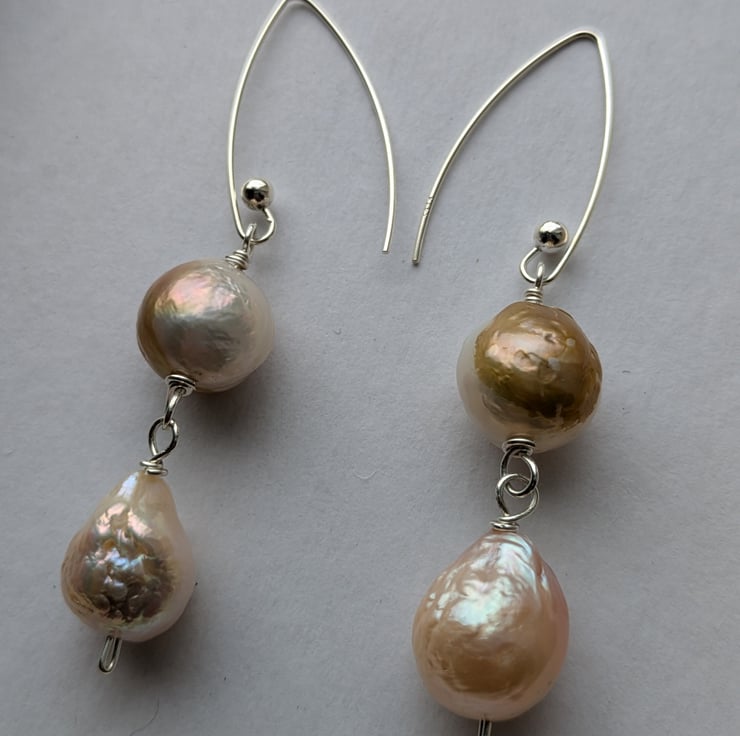The Gang of Pearls earrings - The pearls in these statement earrings are each unique, they absolutely don't match but they very much like to hang out together (literally) - a happy little gang of pearls! I wire wrapped these Chinese freshwater 'ripple' pearls (so-called because of their rippled nacre) in solid sterling silver and finished them with large modernist hooks. The earrings have some wonderful juxtapositions of texture, colour and form and will look great with a t-shirt, a wedding dress and everything in between.