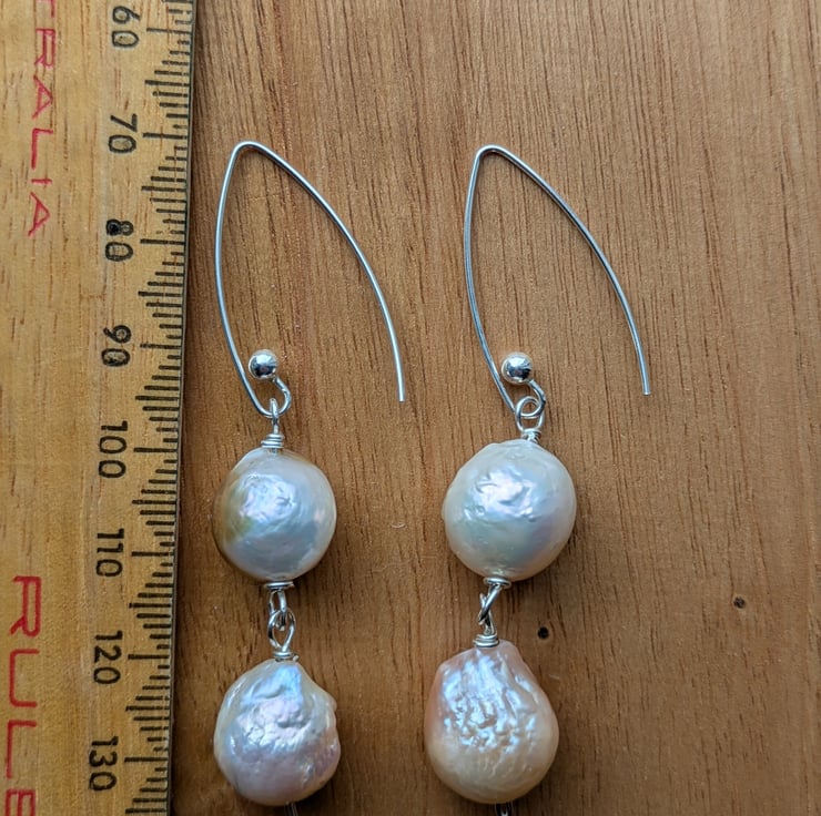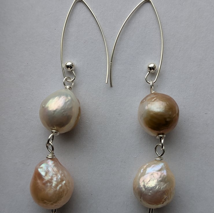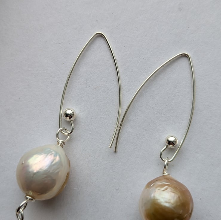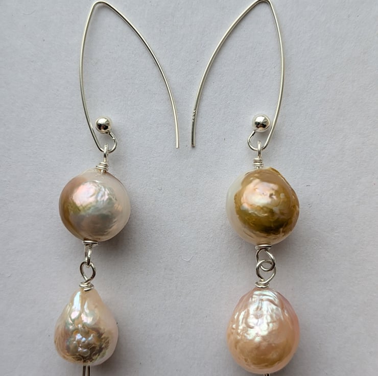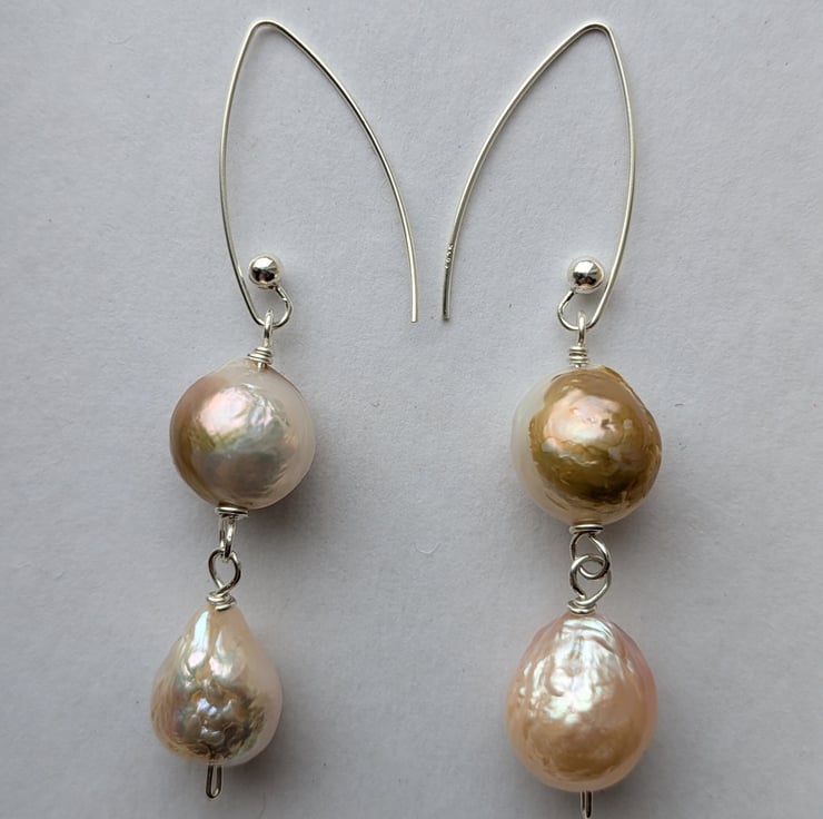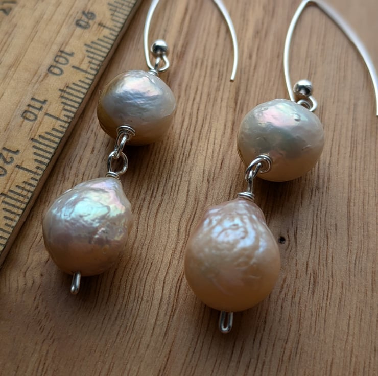 About the pearls: the pearls used in these earrings are reclaimed nucleated Chinese freshwater pearls. Bead nucleation (a similar process to that used in salt water pearl production) is the most recent advance in Chinese freshwater pearl farming and results in larger rounder pearls than previous freshwater pearl farming techniques.