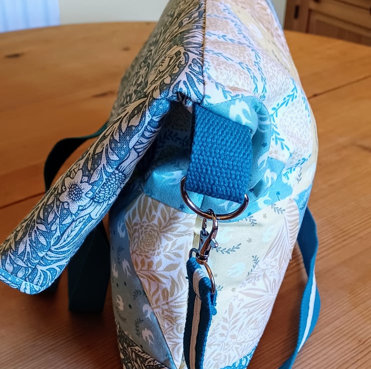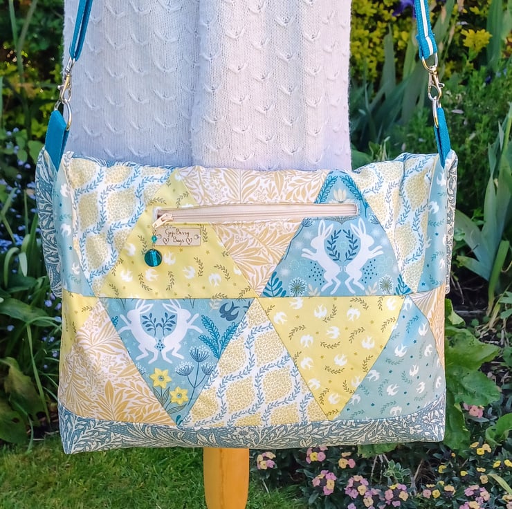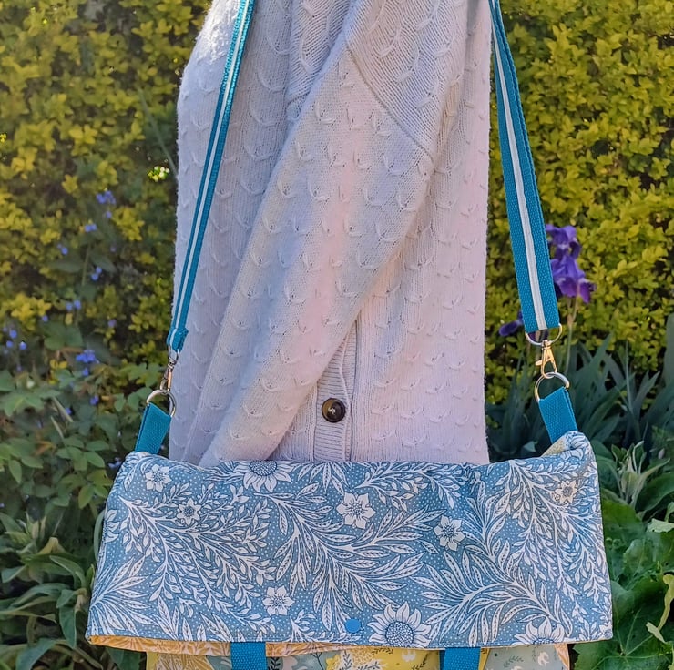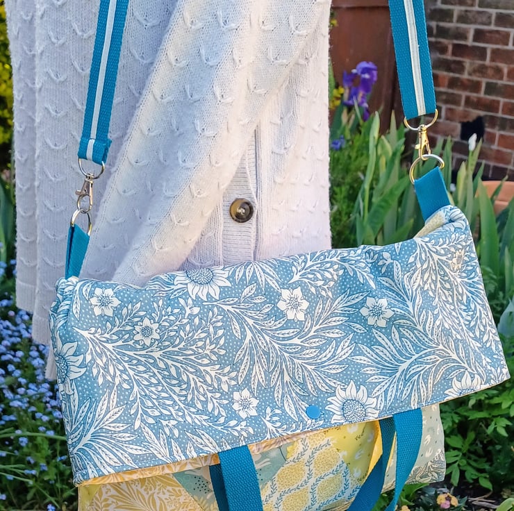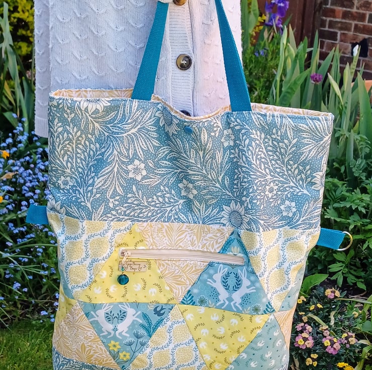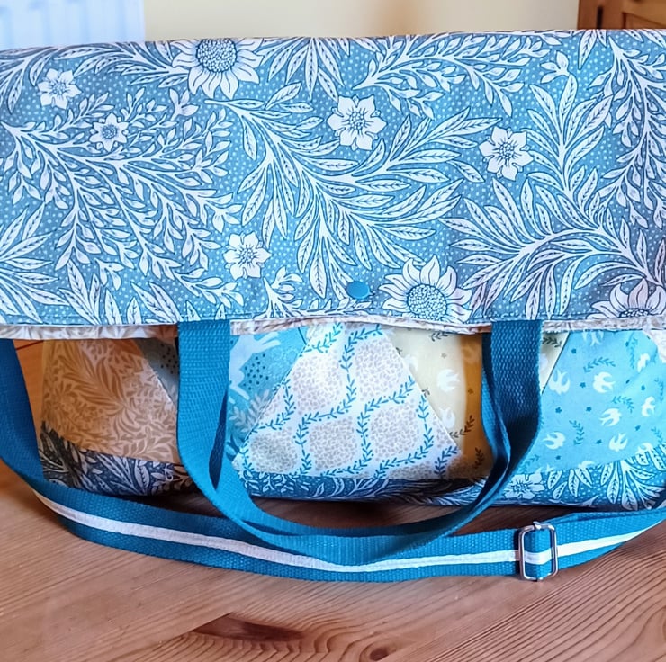 This beautiful bag is effectively 3 bags in one! It can be used as a large shoulder/tote bag with its adjustable strap or, if you remove the shoulder strap you can turn it into a shopping bag - probably the most versatile bag you will ever own! Apart from its versatility it is also beautifully made with patchwork triangle panels on both sides and top and bottom in contrasting blue and cream floral fabric. The long adjustable (removable) strap has a contrasting cream ribbon detail stitched onto it to add extra detail. Whilst the front of the bag (which folds over when used as a shoulder/tote bag) features the patchwork design alone, the other side also has a large zip pocket so your phone and keys stay handy without having to dive into the depths of the bag and search through your shopping, and the top of the bag is finished with a blue snap fastener to keep the bag closed once full. Inside, the bag is lined with an ochre and cream fern fabric. There are two pockets, one with a snap fastener and big enough for all your other essentials you need easy access to. The other pocket is the right size for a phone. Measurements approx: width: 16.5"; height: 18.5" (when fully extended, excluding handles), 12.5" when folded over; bottom width 2.5".