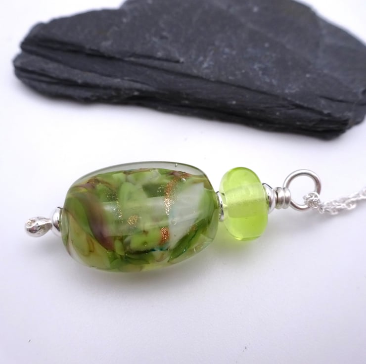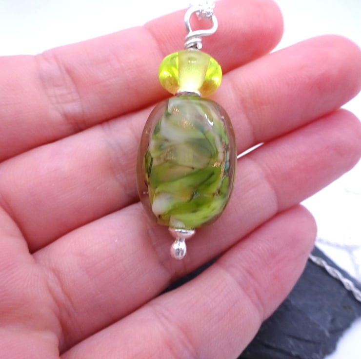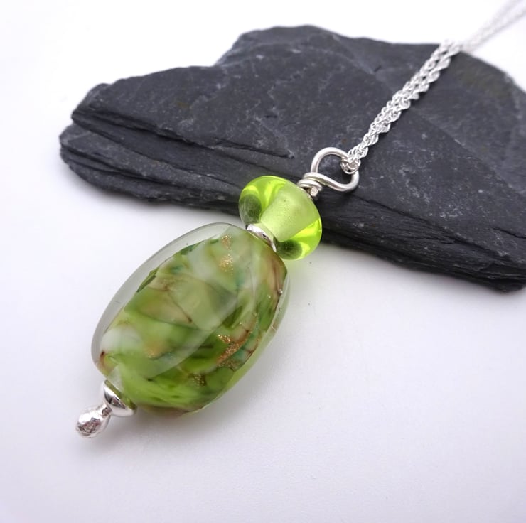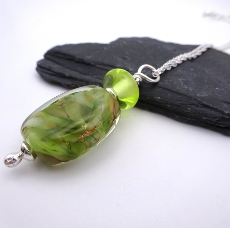 A sterling silver chain which has been strung with a handmade lampwork glass pendant.