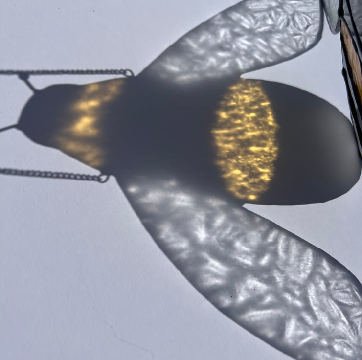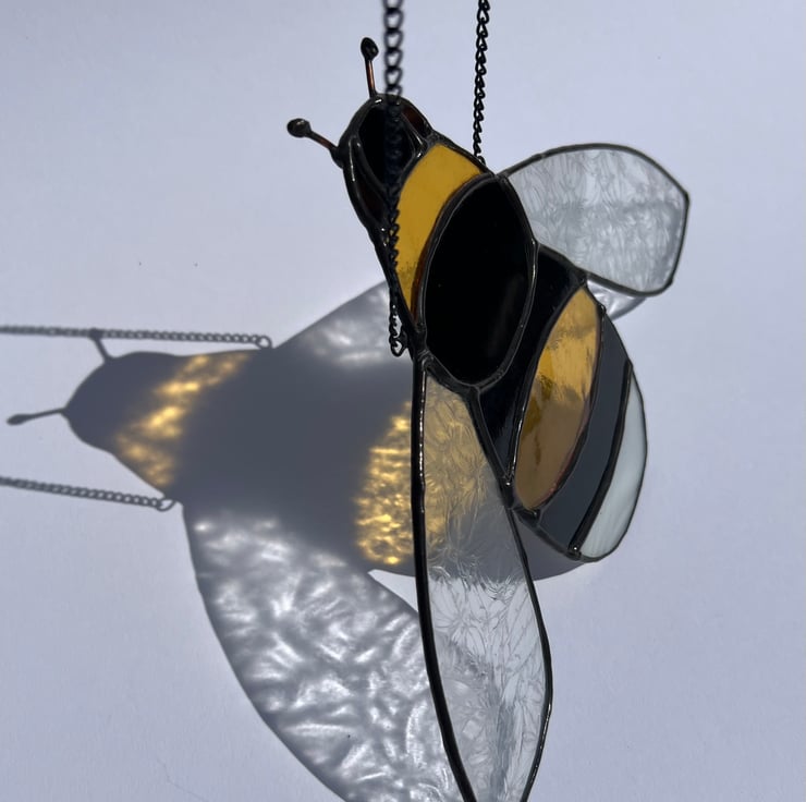 A stained glass bee! A great gift for gardeners, nature lovers, bee aficionados, and people who want a decoration with a difference.