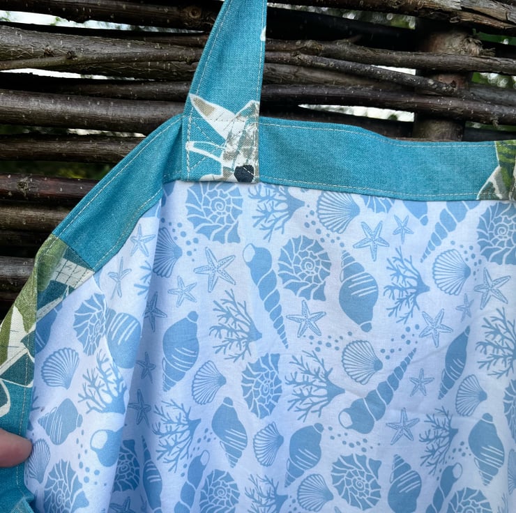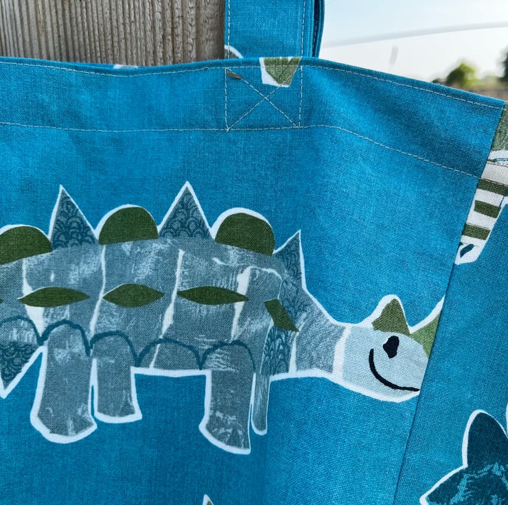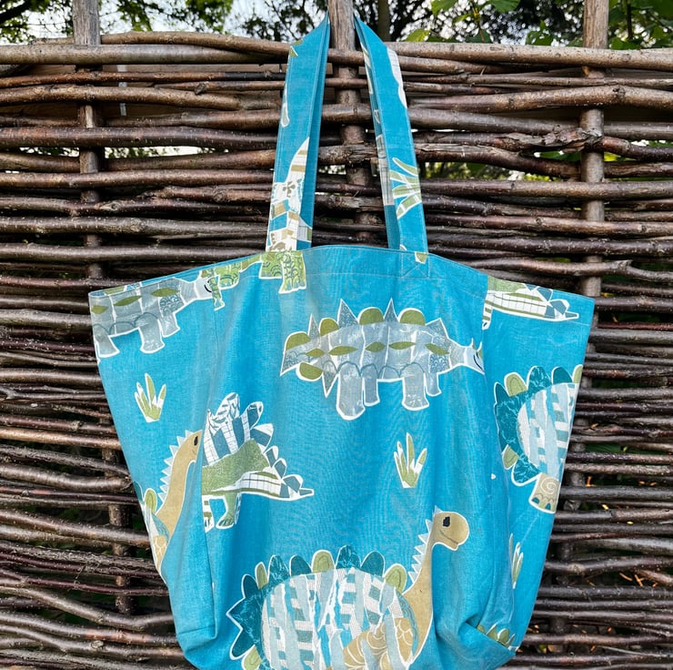 Big, strong tote bag in reclaimed dinosaur curtain fabric in a deep turquoise blue with cute Jurassic print in shades of green. The bag is fully lined with seashell print cotton. There is a T-Rex patch pocket inside.