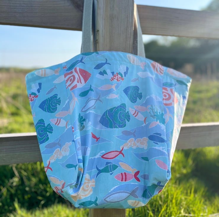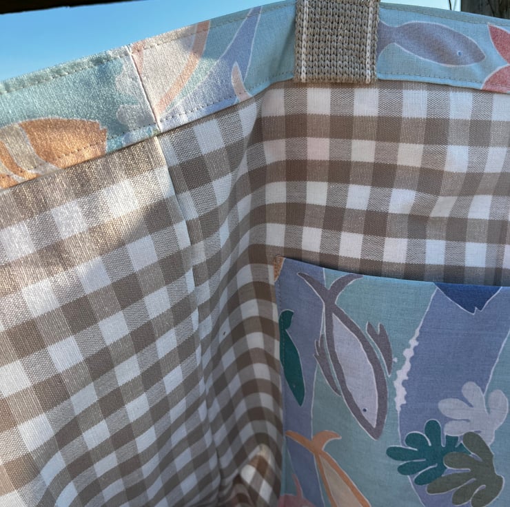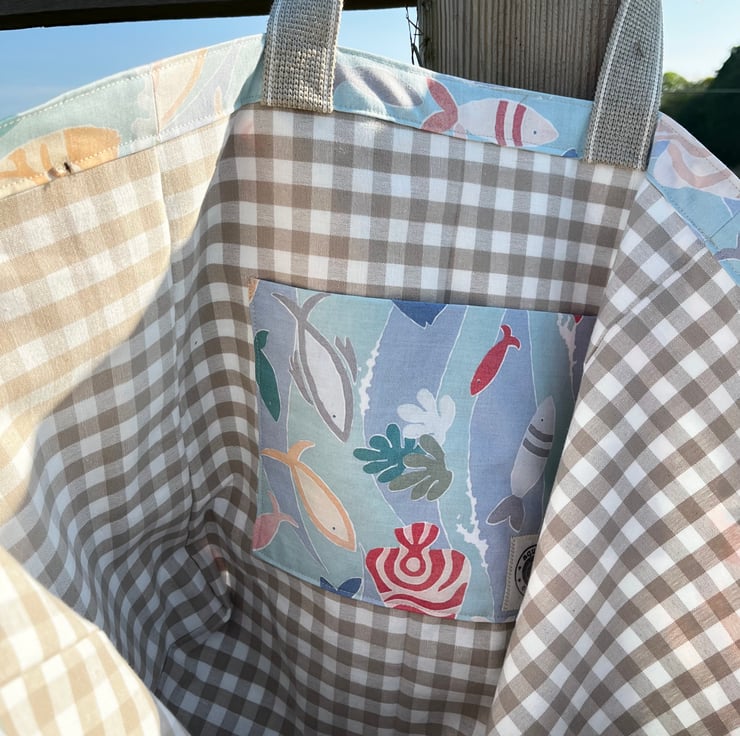 Big, strong tote bag in reclaimed Laura Ashley fish print curtain fabric in soft pastel shades. The bag is fully lined with beige and white gingham. There is a fishy patch pocket inside.