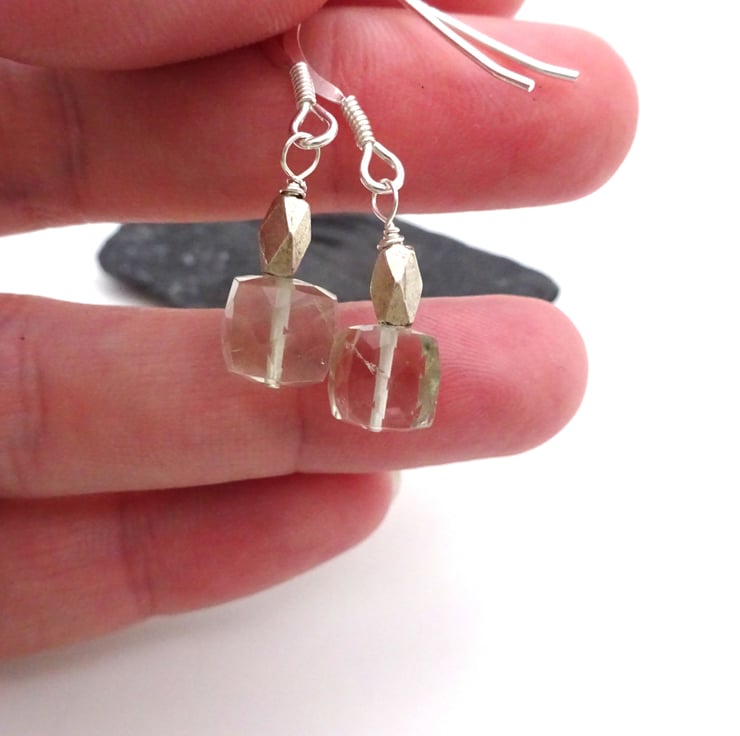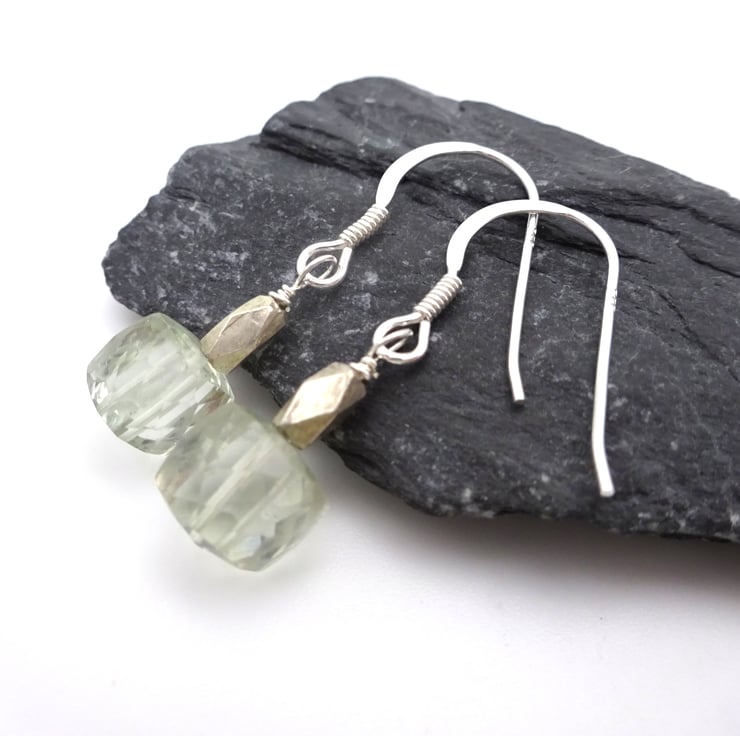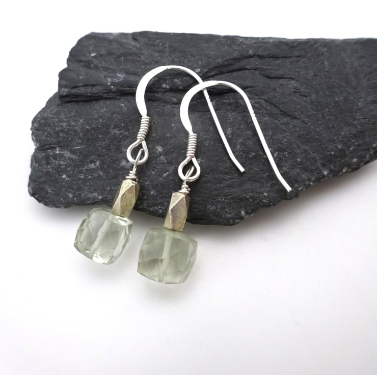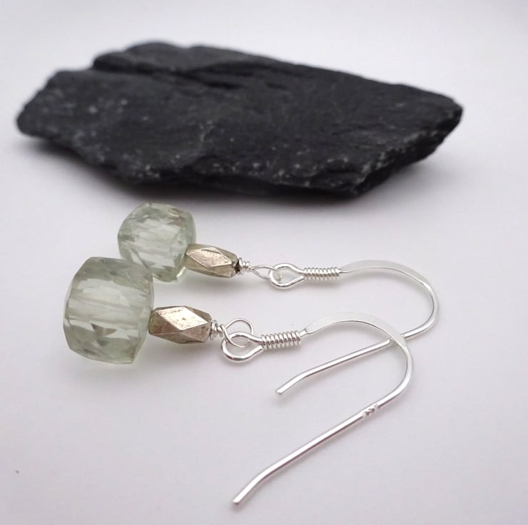 A pair of sterling silver earrings featuring silver tube beads and Grade AA Green Amethyst gemstone beads.
