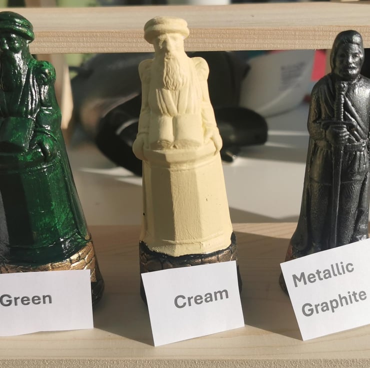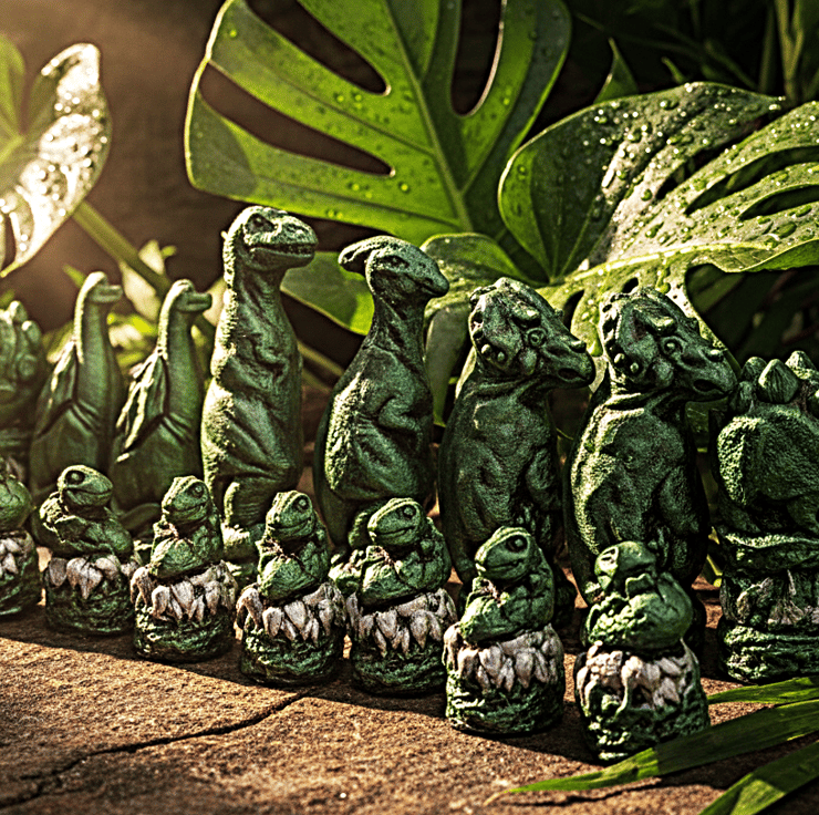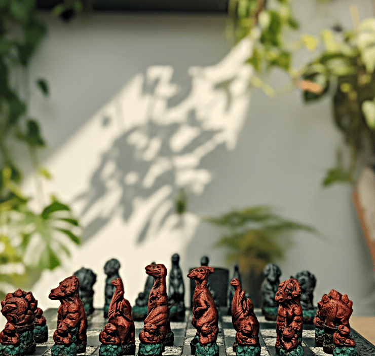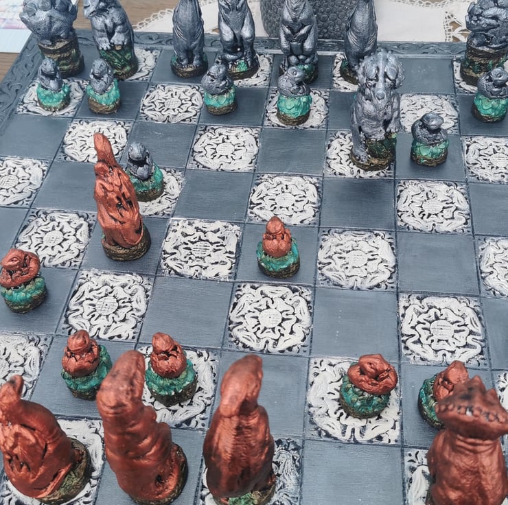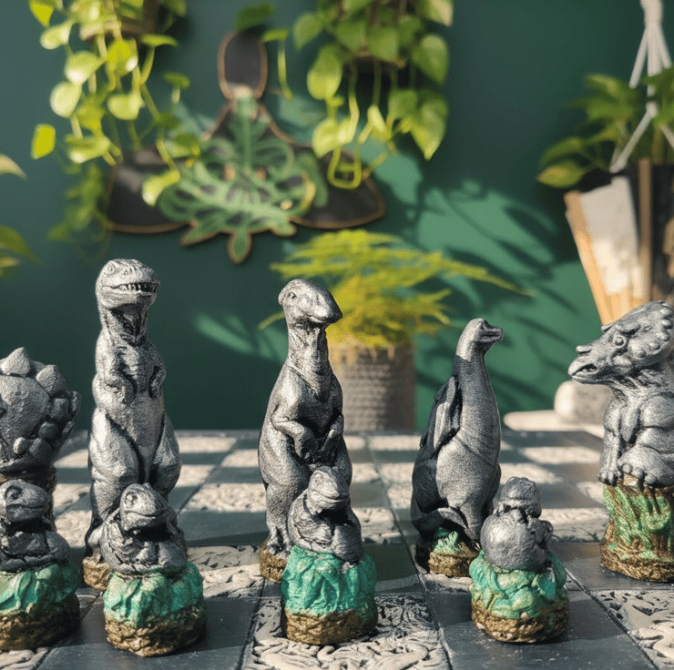 When you order this set, you have the power to choose from a wide range of finishes. The sample photographs showcase the Dinosaur set in Silver and Red Bronze, but you can also see the other available colours in three other photographs. This customization allows you to create a chess set that truly reflects your style and preferences.