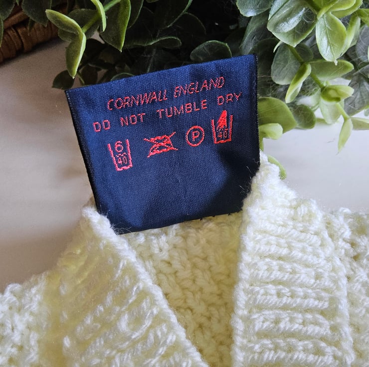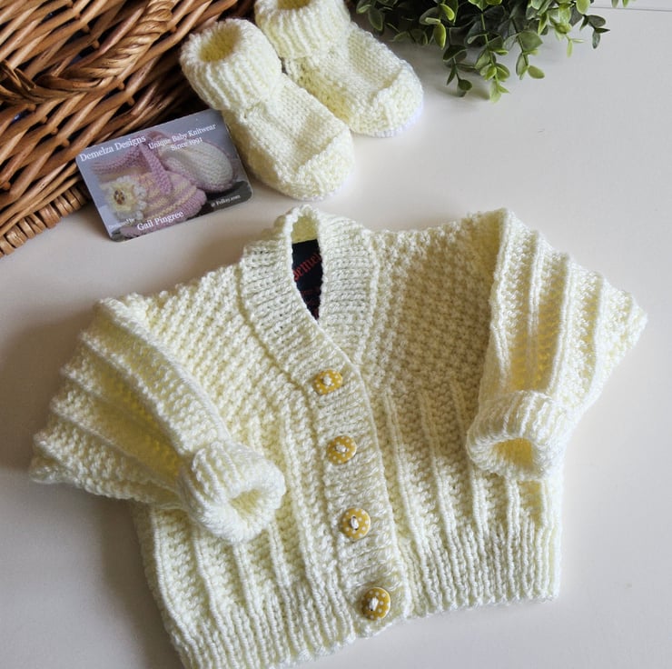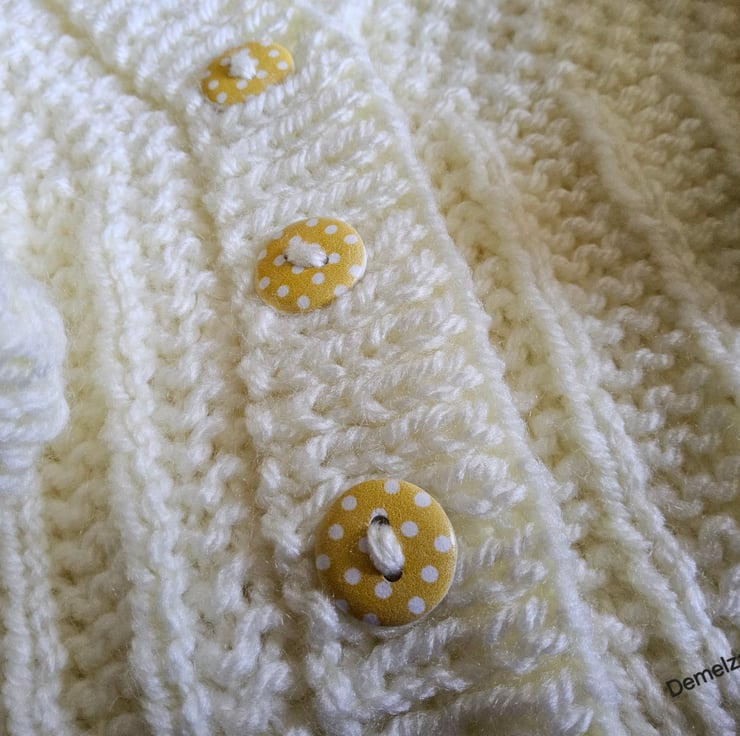 On the cardigan back neck the branded luxurious Demelza Designs garment label (also made in Cornwall) has the care instructions woven within it on the reverse side for lasting reference. Prior to dispatch a branded Demelza Designs garment swing tag will be attached to the front providing a professional touch, especially if gifting. The booties have a piped knitted edge to define the sole and give them a boot shape. The buttons are made from genuine wood with a polkadot design on them.