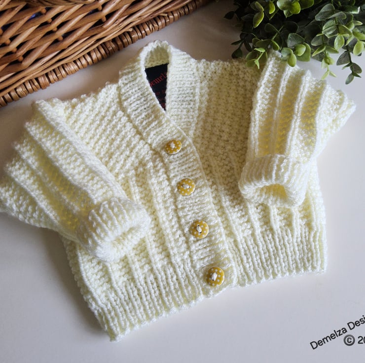 This cosy warm baby cardigan has been lovingly designed and hand crafted in Cornwall using quality branded premium machine washable acylic yarns. The colour is ideal to go with any new borns wardrobe collection.