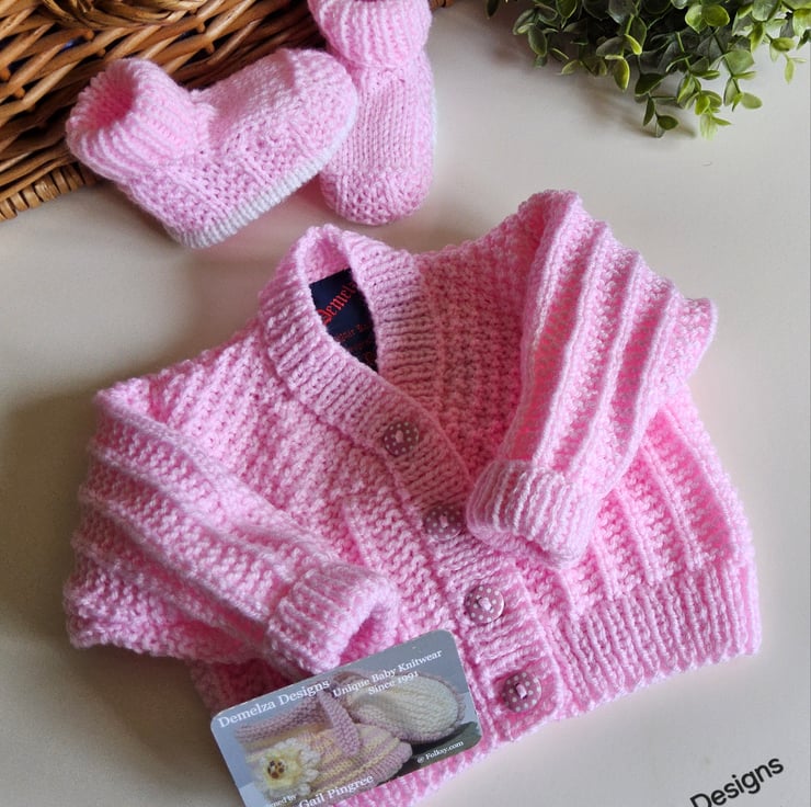 On the cardigan back neck the branded luxurious Demelza Designs garment label (also made in Cornwall) has the care instructions woven within it on the reverse side for lasting reference. Prior to dispatch a branded Demelza Designs garment swing tag will be attached to the front providing a professional touch, especially if gifting. The booties have a piped knitted edge to define the sole and give them a boot shape. The buttons are made from genuine wood with a delicate polkadot design on them.