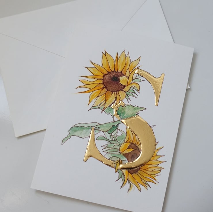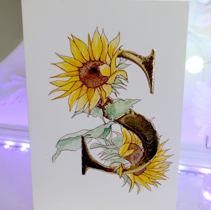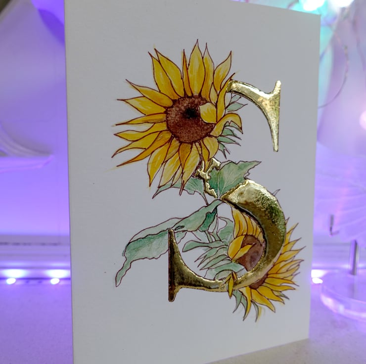 Blank card for any occasion with a hand painted sunflower in watercolour and 24 carat gold leaf letter S. This unique art card can be framed after use as the piece signed and dated on the back.