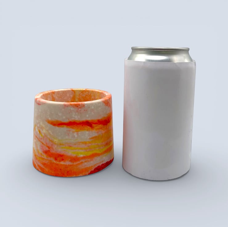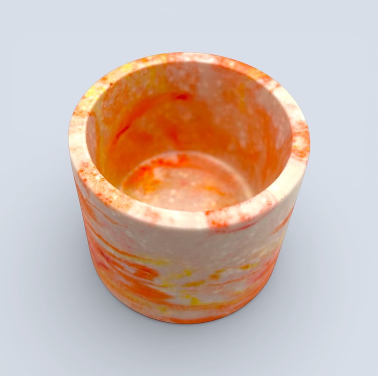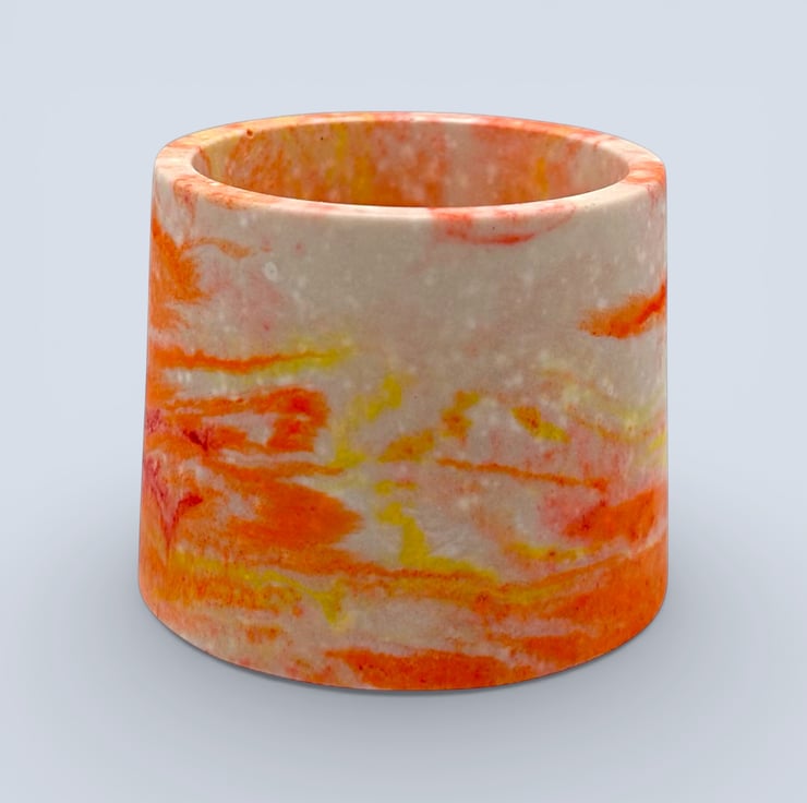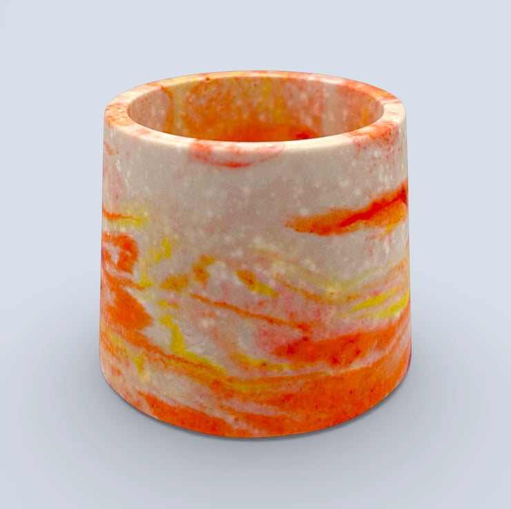 The pot is handmade from a water based mineral material with a smooth, stone like feel. The marbled colours run through the piece rather than sitting on the surface. The exterior has been hand finished through multiple stages and polished with a plant based wax sealer for a soft satin sheen, while the interior is sealed with varnish for added durability. Small air bubbles and gentle colour variations are part of the handmade process and add to the individuality of each pot.