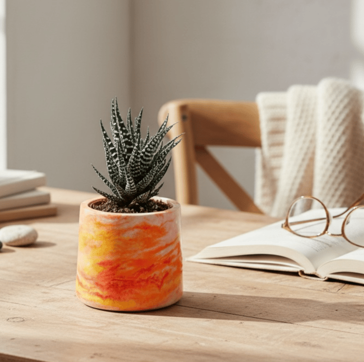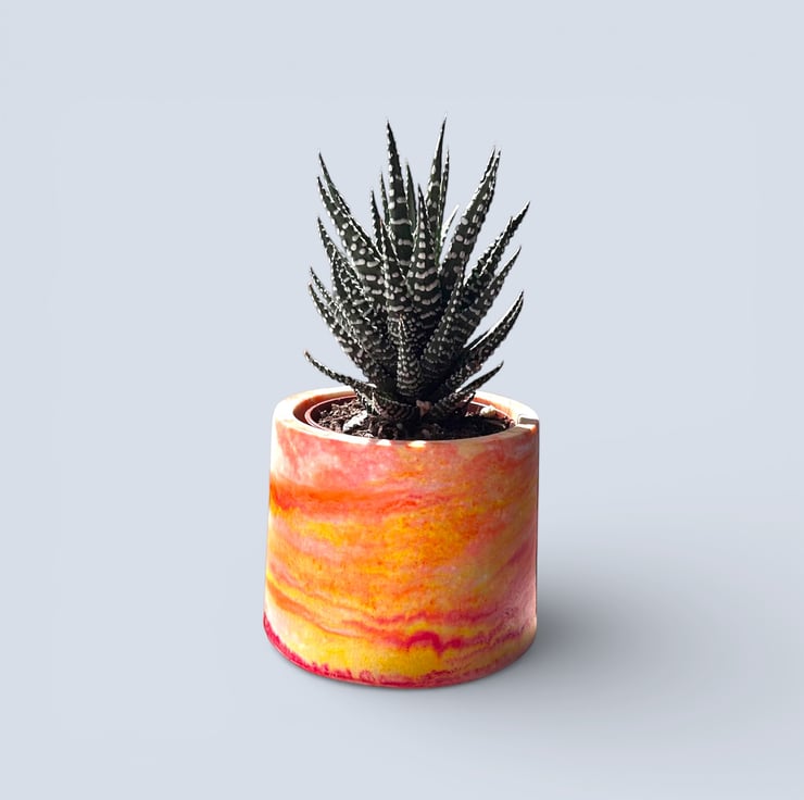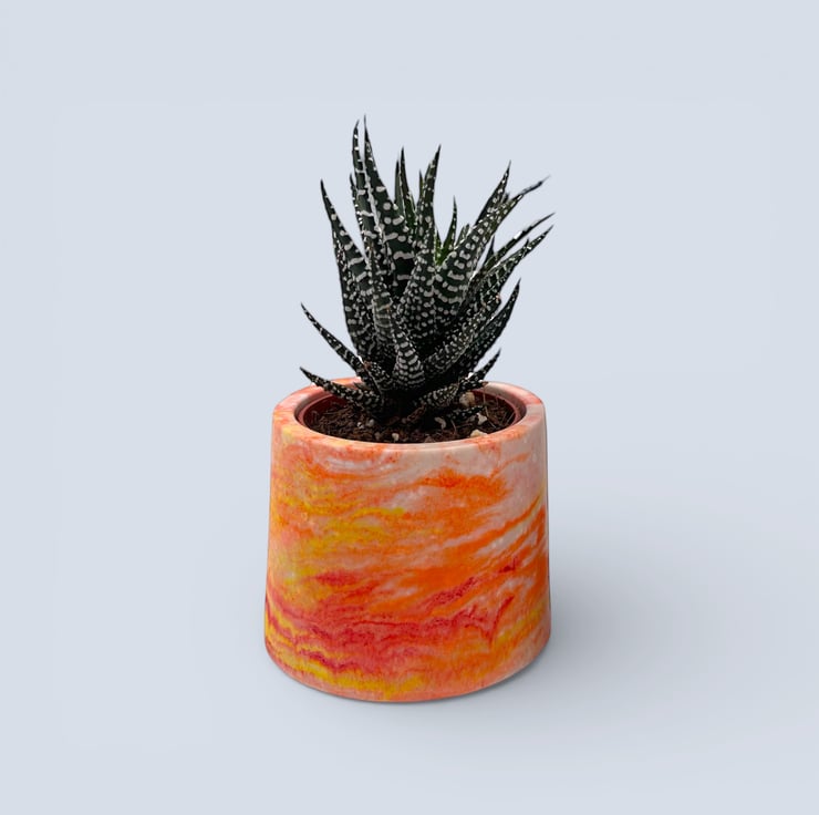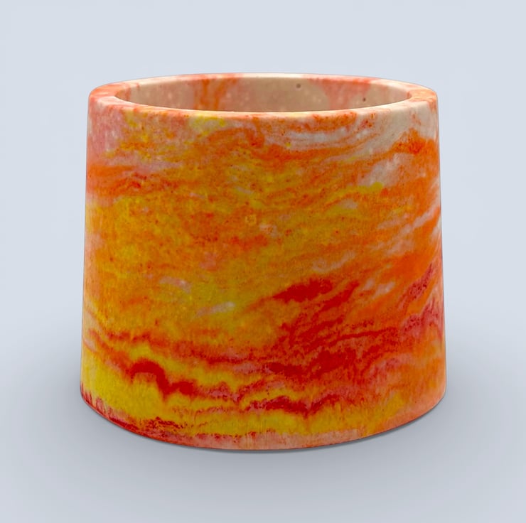 Small sunrise marbled round plant pot for indoor houseplants, succulents and cacti. This 7.5 cm mini planter features flowing red, orange and yellow tones inspired by the warmth of a rising sun. The vivid marble effect wraps around the pot, making each piece completely unique and a lovely gift for plant lovers or a cheerful accent for desks, shelves or windowsills.