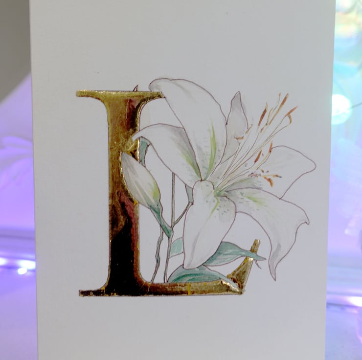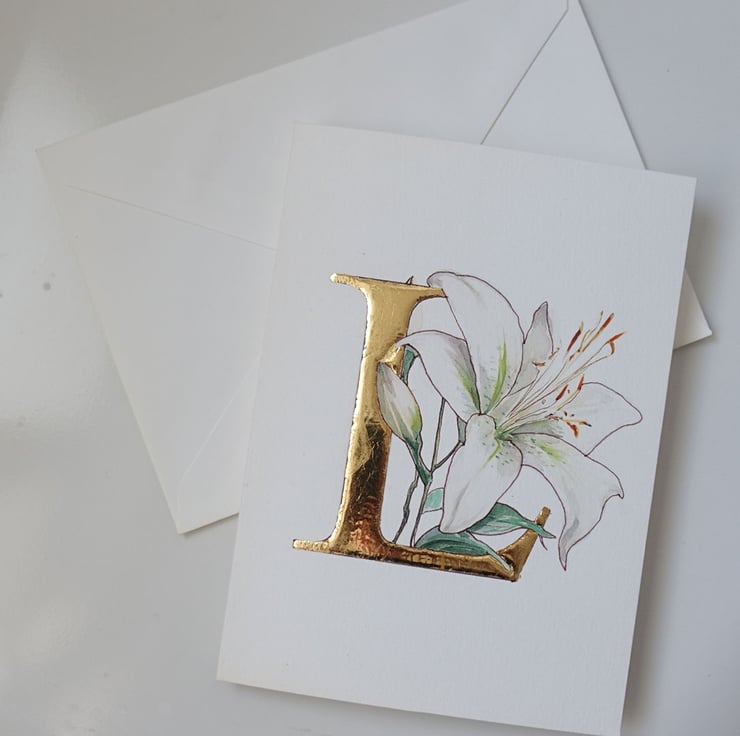 This card is so delightful in its simplicity. A single white watercolour oriental lily entwined around a pure 24 carat gold letter L.