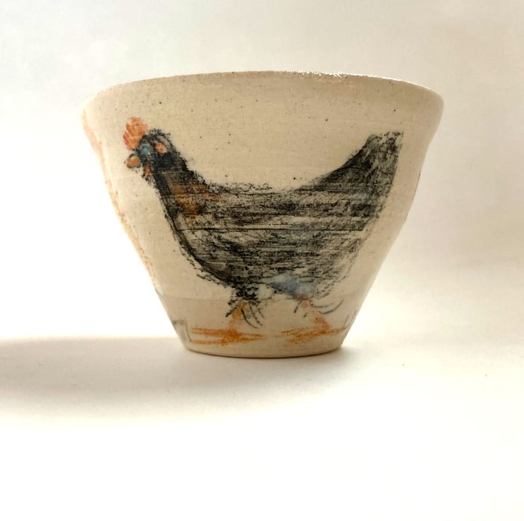 Hand thrown small bowl, hand decorated with illustrations of hens on the outside and a small fox head in the inside. Don't worry, the hens and fox are great friends so all are safe!