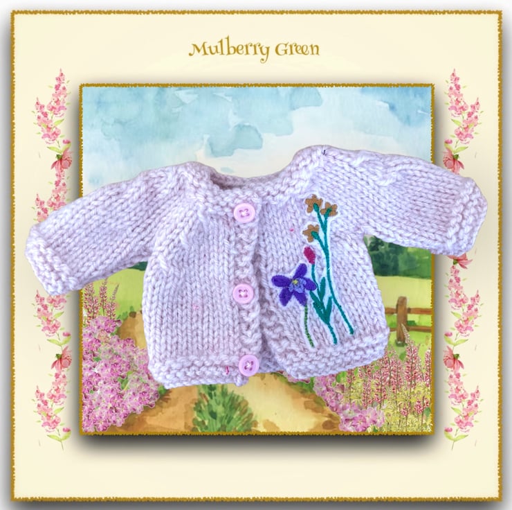A beautiful little blush pink cardigan, embroidered with flowers, to fit the Mulberry Green characters. The cardigan is hand knitted and is finished off with three little buttons.