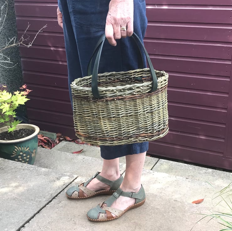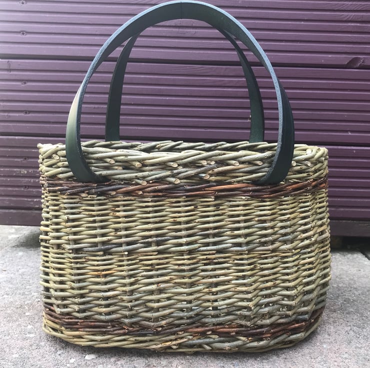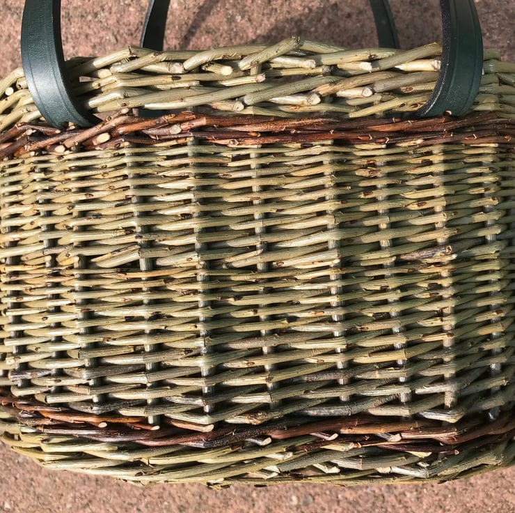 A beautiful oval willow basket woven from Dicky Meadows willow with a contrasting stripe of Flanders Red, perfectly finished with quality English leather handles handmade by my friend Becs Ball from Bosorne Leatherwork.