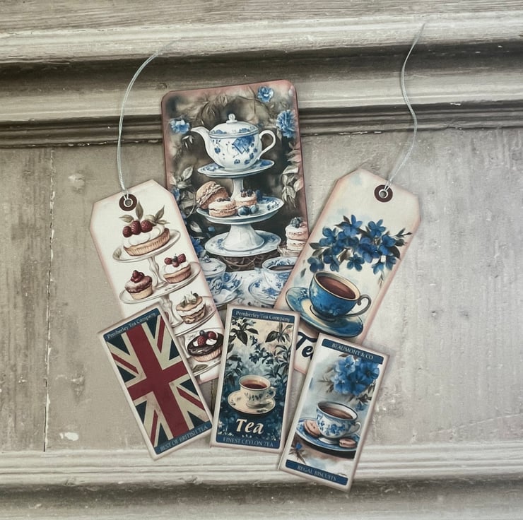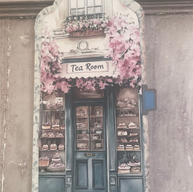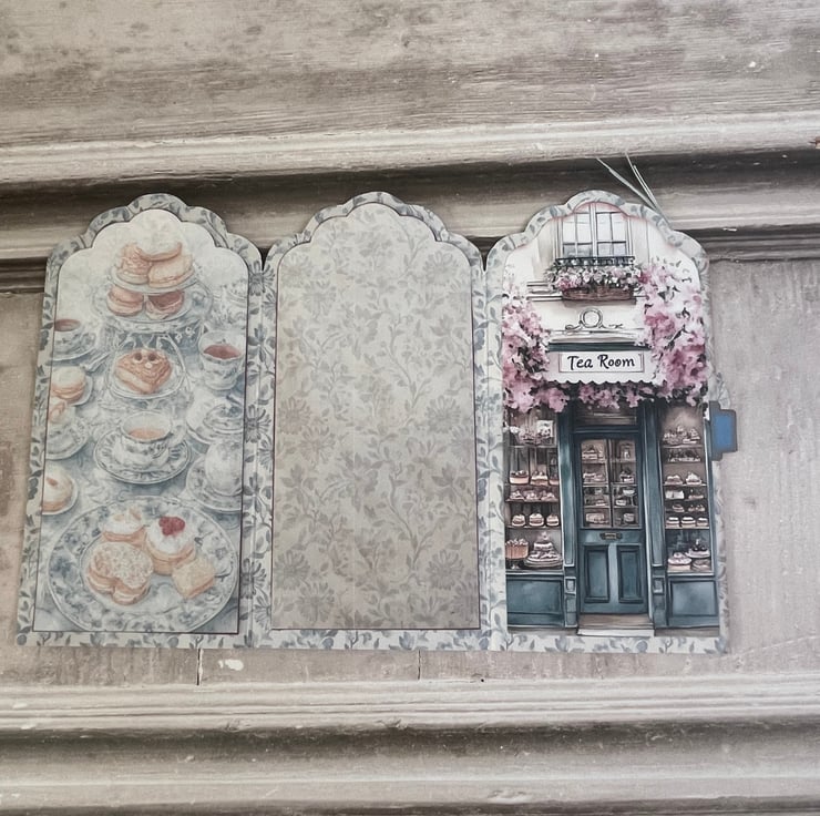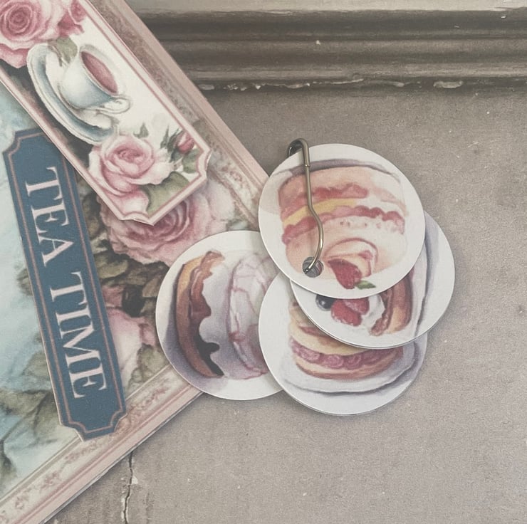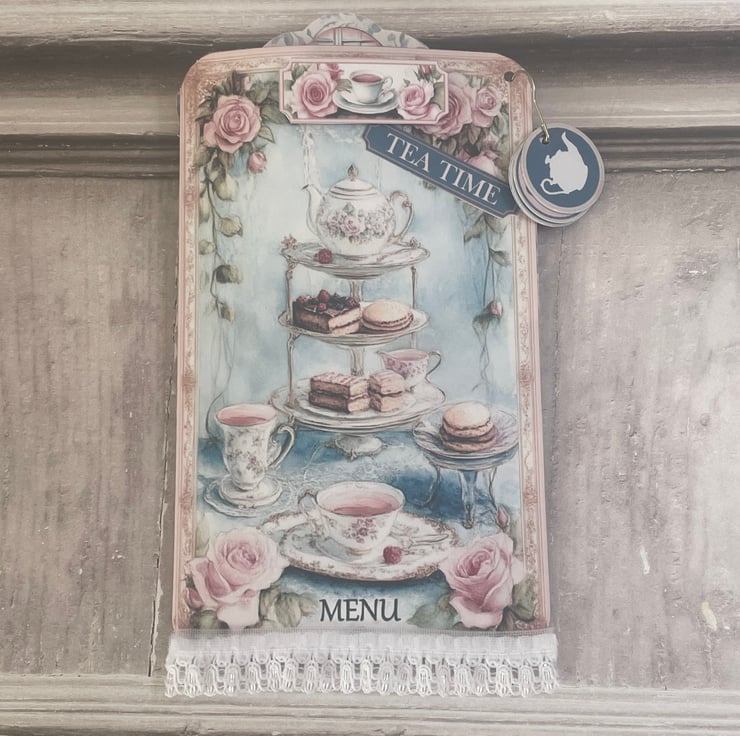 Pretty Tea Time pocket with a beautiful image of afternoon cakes and tea cups on the front. Menu of the tea room on the back. Embellished with a mini teacup and roses label, Tea Time sentiment with lace trim. Silver bulb pin with 4 circles of cakes and teapots on the back.