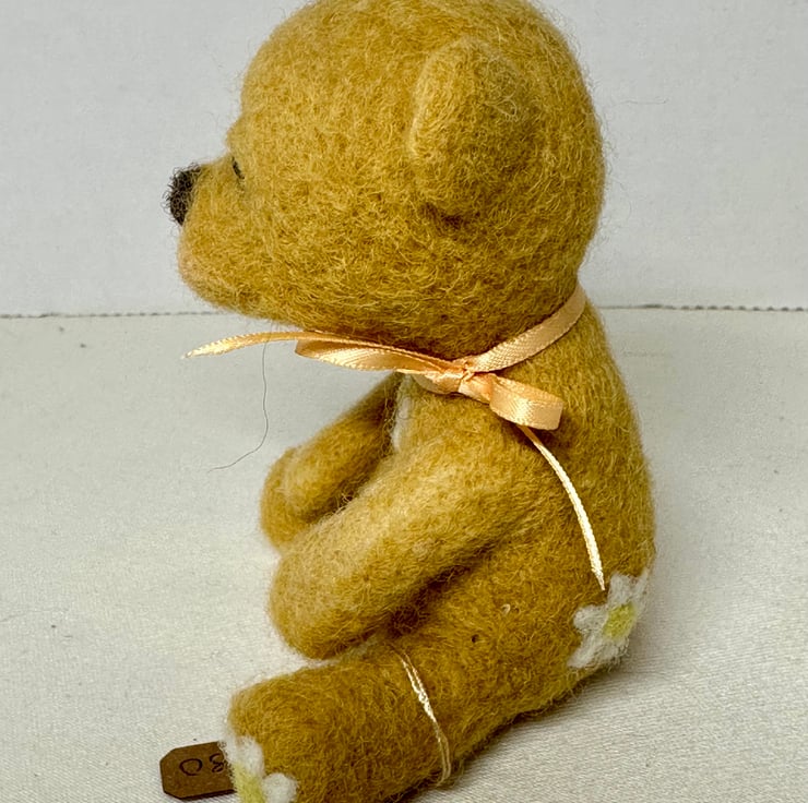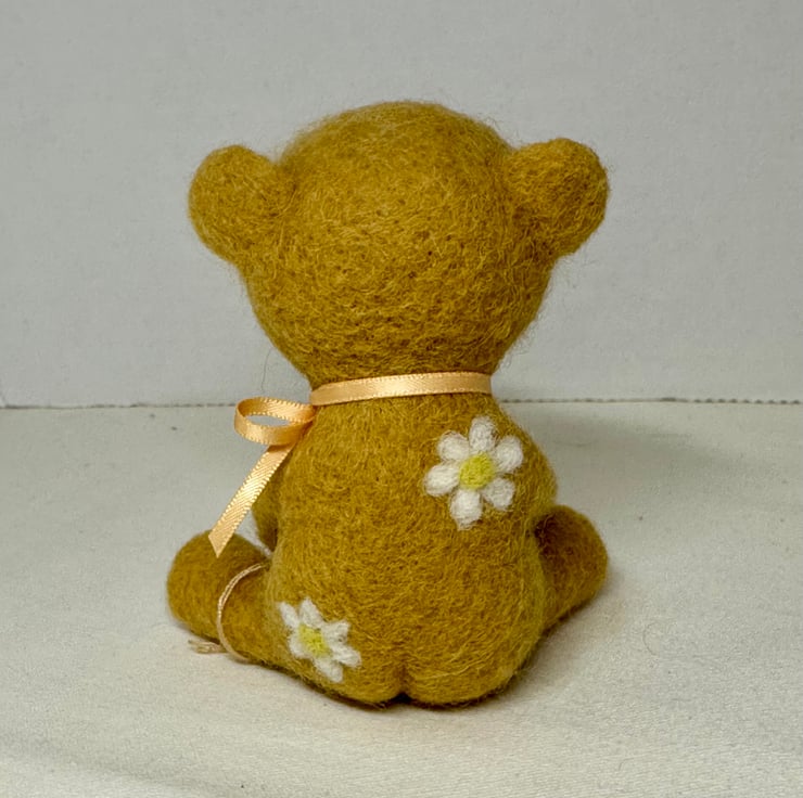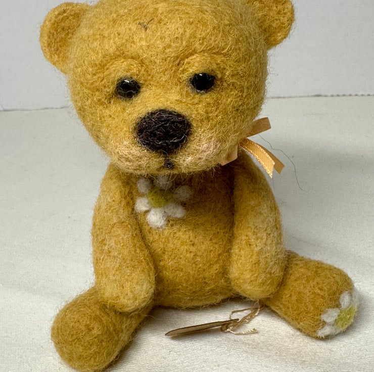 Needle felted wool with bead eyes and a faux satin bow adorned with daisies