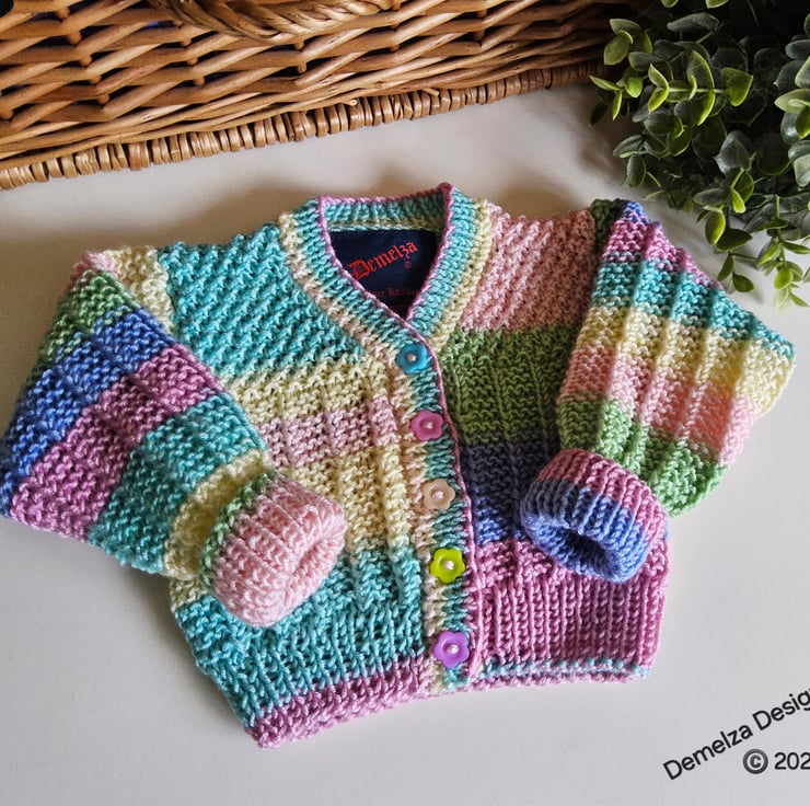 This cosy warm baby cardigan has been lovingly designed and hand crafted in Cornwall using quality branded premium machine washable acylic yarns. The yarns has a silky supper soft touch and the colours are ideal to go with any new born's wardrobe collection.