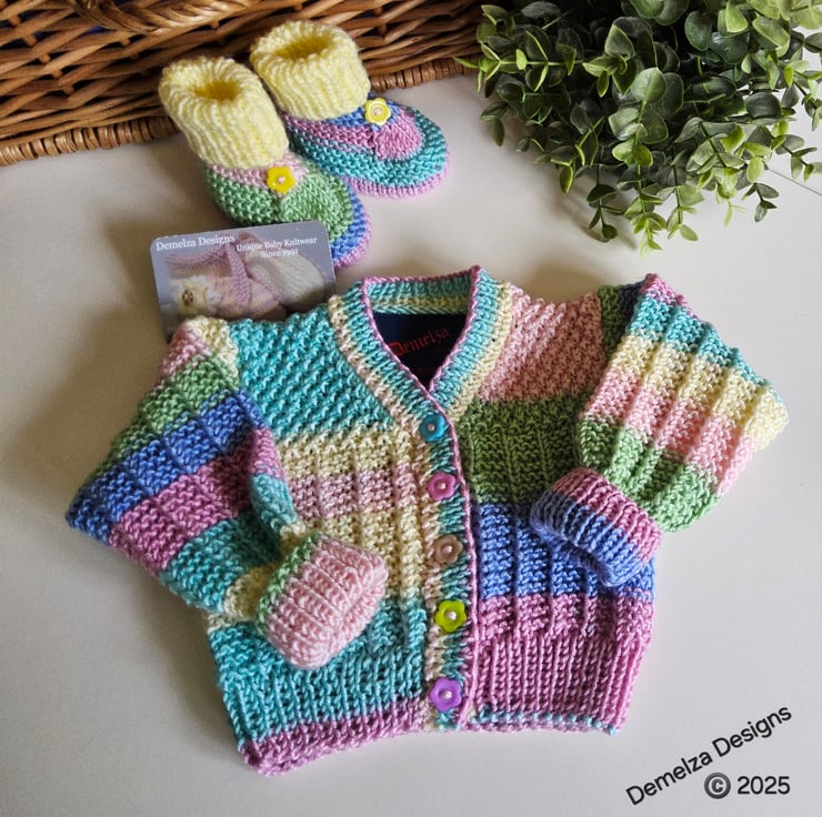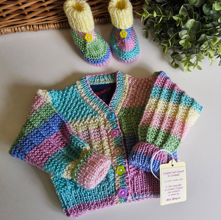 On the cardigan back neck the branded luxurious Demelza Designs garment label (also made in Cornwall) has the care instructions woven within it on the reverse side for lasting reference. Prior to dispatch a branded Demelza Designs garment swing tag will be attached to the front providing a professional touch, especially if gifting. The booties have a piped knitted edge to define the sole and give them a boot shape. The buttons have a flower shape to them.
