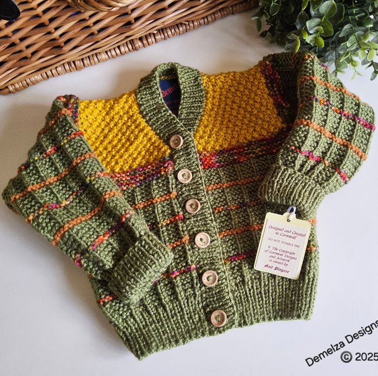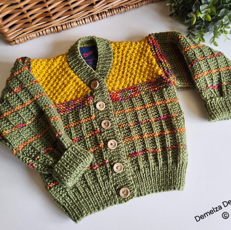 A unique eye catching practical baby boy's cardigan designed and totally hand knitted in Cornwall using top quality premium branded designer acrylic machine washable yarns. The colours are perfect to be worn with most boy's clothing collection whilst proving versatility of colourways.