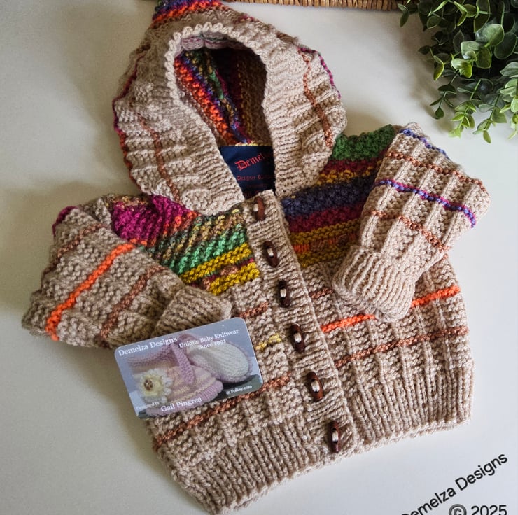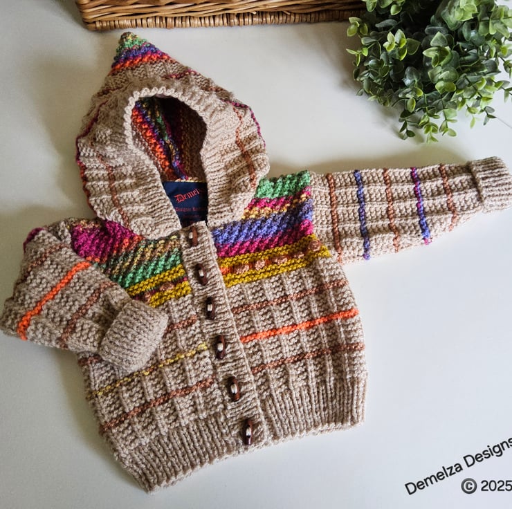 A practical designer baby hand knitted textured hooded jacket for those seeking total individuality. It will make a perfect genuine designer baby gift for a new born, baby shower, expecting congratulations gift or for perants looking for quality unique baby knitwear for their little one.
