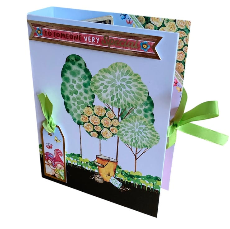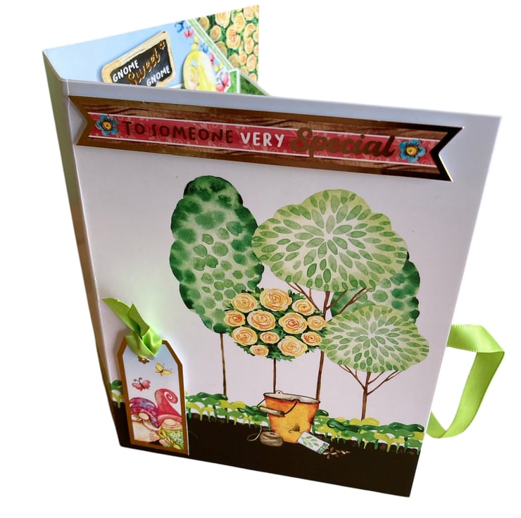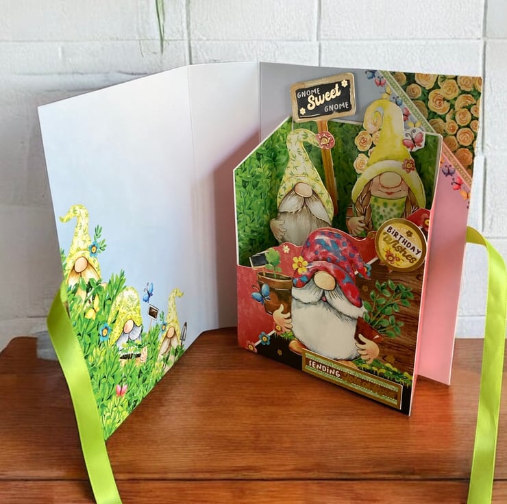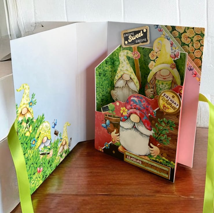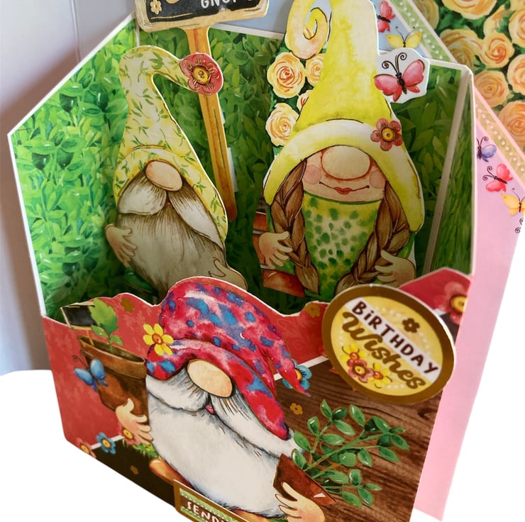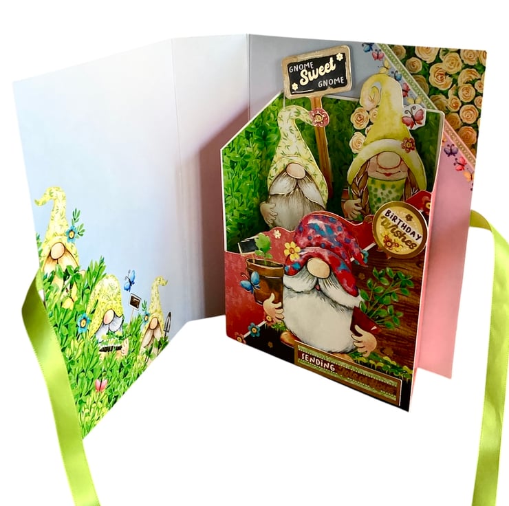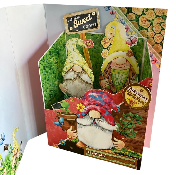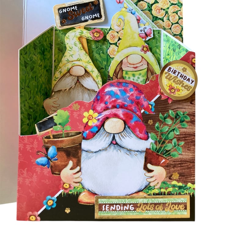 The card has been made using quality card decorated with a garden design featuring gnomes. Inside of the book a little box has been added with pop up gnomes and a sign saying Gnome Sweet Gnome. The sentiments Birthday Wishes and Sending Lots of Love have been added to the box.