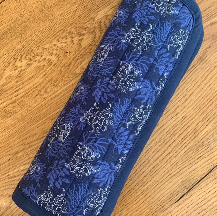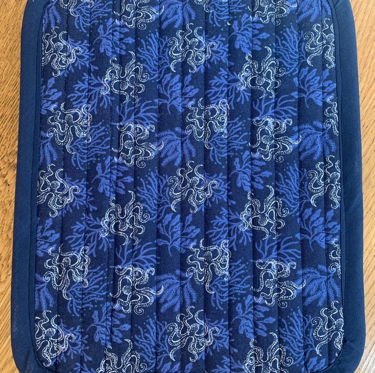 A beautiful mat made with octopus print cotton to use everyday or when travelling. The mat prevents heat damage to surfaces. This is due to the mat and pocket being quilted on to Insulbrite thermal wadding.