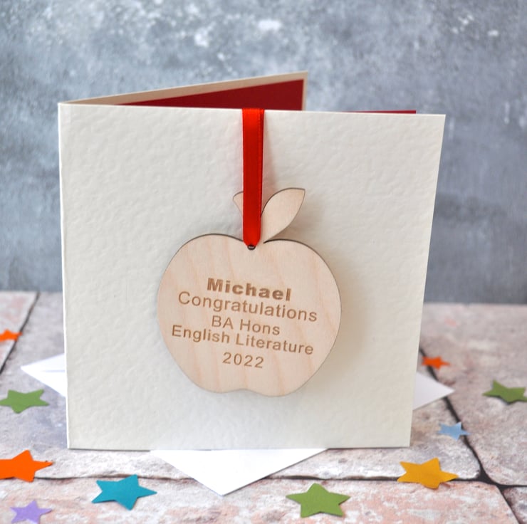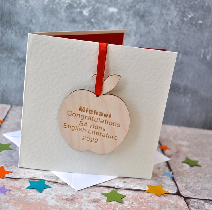This quirky hammered Graduation card includes it's very own personalised wooden apple decoration.