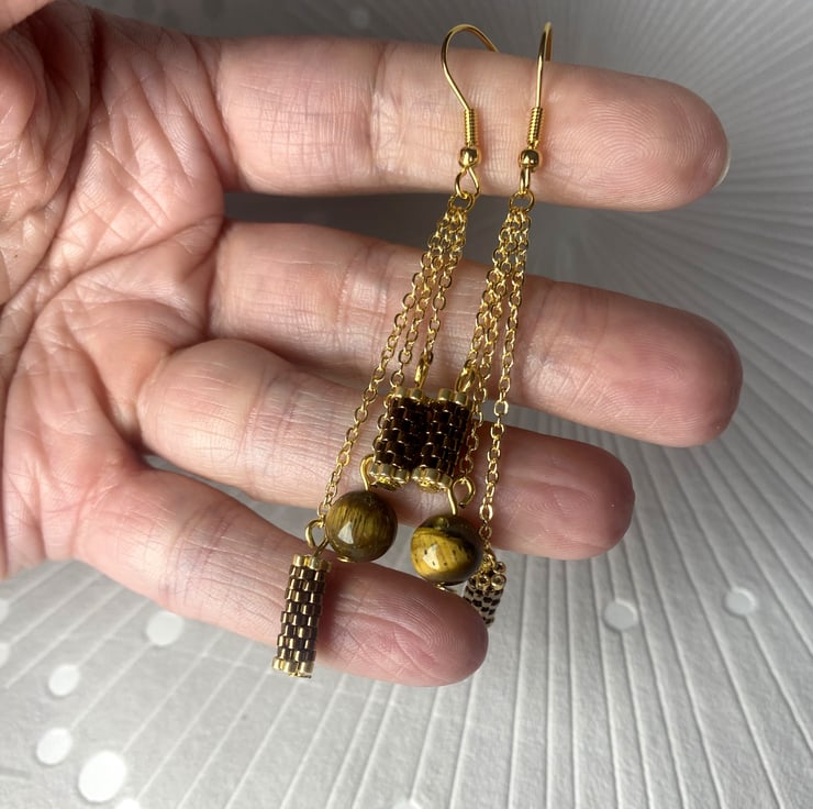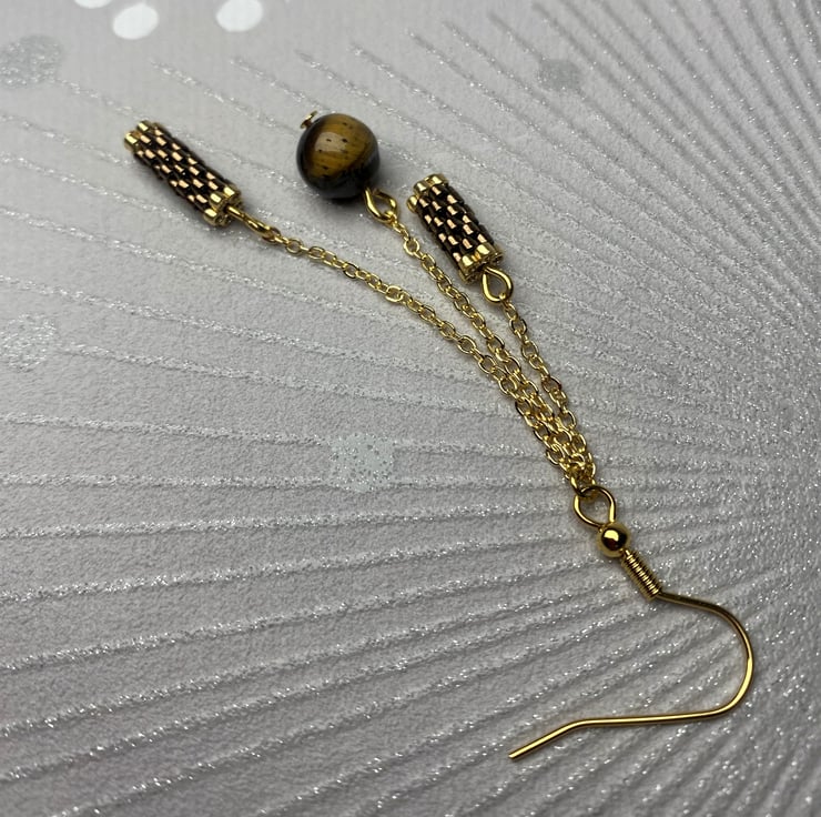 Materials: high quality Japanese mijuki delika beads, tiger's eye beads, gold plated chains, gold plated findings, gold plated surgical steel earring hooks.
